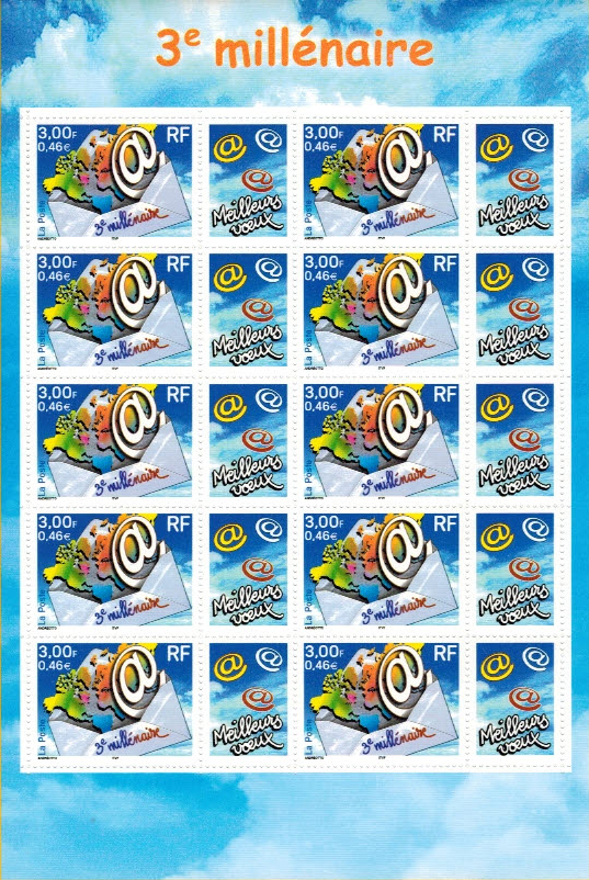 | Commentaire | Émis en bloc-feuillet de 10 timbres avec vignette. Description synthétique du visuel du timbre : Dans la série des semi-permanents, La Poste propose une mini-feuille de 10 timbres avec vignettes pré-illustrées. Le visuel, orienté nouvelles technologies, illustre le mariage du courrier et de l’internet, symbole de l’entrée dans le 3e millénaire. Timbre sans millésime |