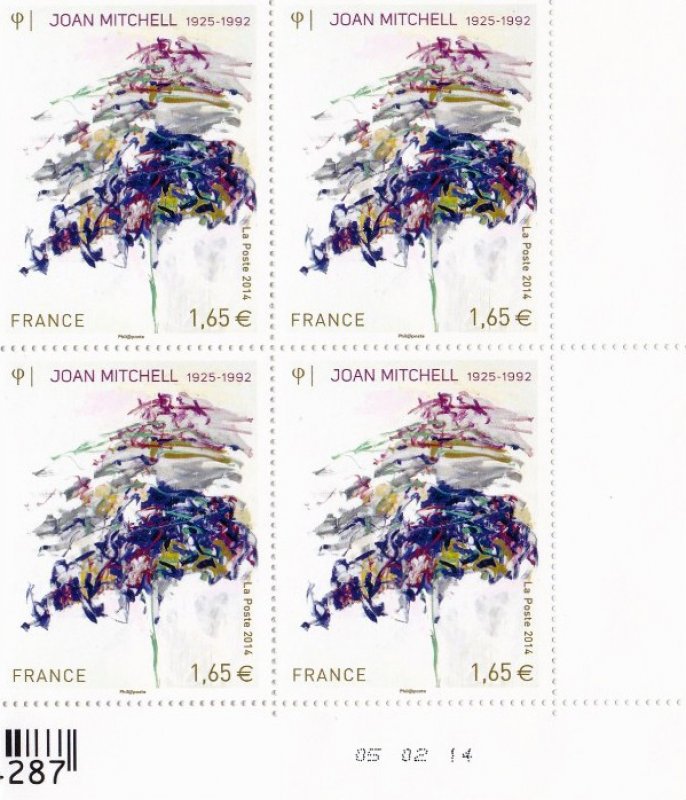 | Commentaire | Imposition des TP : 6 bandes de 5 TP Voir plus d'information sur Wikipédia : Joan Mitchell Timbre à date “Premier Jour” conçu par Valérie Besser Artiste-peintre américaine, Joan Mitchell est née à Chicago en 1925. Influencée à ses débuts par Van Gogh, Cézanne, et Kandinsky, puis par Willem de Kooning, elle est une des plus célèbres représentantes du mouvement expressionniste abstrait. Elle débarque en France en 1955, habite Paris, puis Vétheuil, dans le Vexin français, où avait résidé Claude Monet avant de s’installer à Giverny. Travaillant sur tous formats, mais préférant les grands, ou réunissant plusieurs toiles en polyptiques, elle a une approche physique, gestuelle, de la peinture. Sportive de compétition dans sa jeunesse, Joan Mitchell conçoit son art avec discipline et rigueur. Ses peintures vibrent sous un réseau de couleurs vives appliquées sur des toiles où les blancs sont subtilement recréés. Atteinte d’un cancer, elle achève son ultime toile, les Tournesols quelques semaines avant sa mort, le 30 octobre 1992. L’oeuvre lyrique, puissante et émouvante de cet immense peintre est célébrée sur chaque continent : ses tableaux sont exposés dans les plus grands musées d’art moderne du monde. |