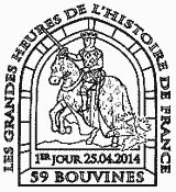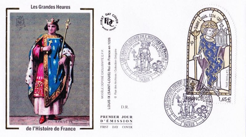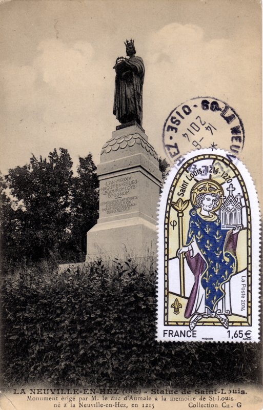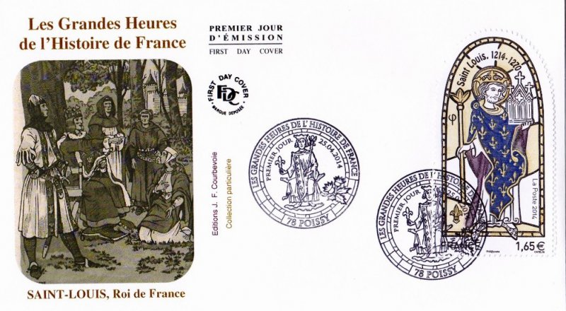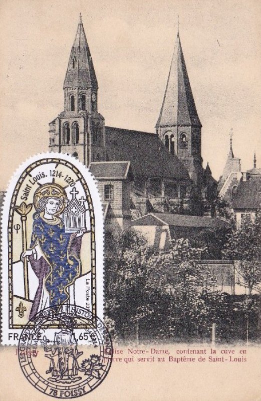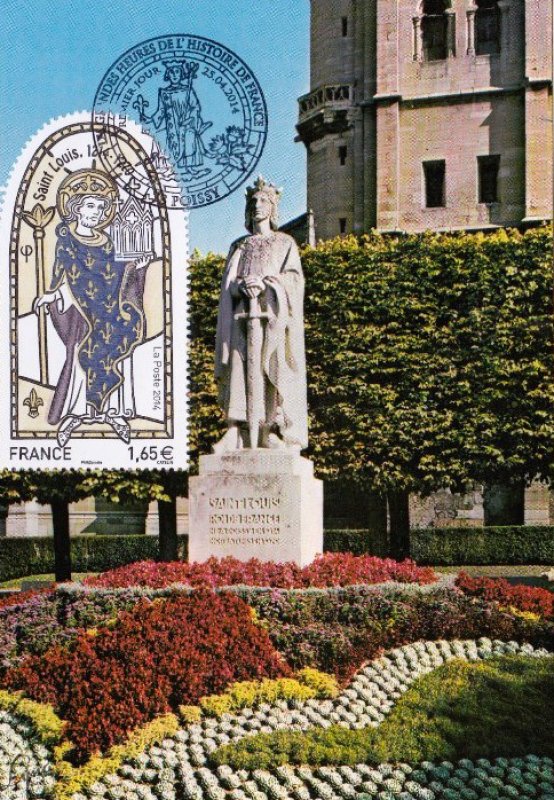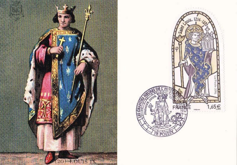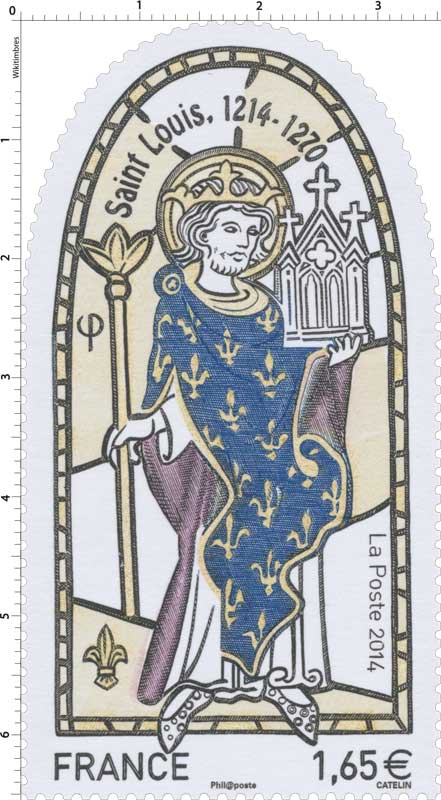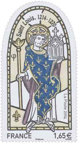 | Commentaire | En savoir plus sur Wikipédia : Louis IX de France En 1214, Jean sans Terre, roi d’Angleterre et fils d’Aliénor d’Aquitaine, décide de récupérer les territoires qu’il possédait jadis dans le royaume de France. Il constitue avec l’empereur Otton IV de Brunswick, Renaud de Dammartin et Ferrand de Portugal une coalition contre Philippe Auguste. Jean débarque à La Rochelle, laissant ses alliés attaquer en Flandre. Mais il est battu à La Roche-aux-Moines. Otton IV attaque l’armée française à Bouvines, près de Lille, le dimanche 27 juillet. Malgré une infériorité en nombre, Philippe Auguste, avec 1 300 chevaliers et 6 000 fantassins, repousse les assauts adverses et, tirant parti de la nature du site, remporte une victoire éclatante. Petit-fils de Philippe Auguste, fils de Louis VIII et de Blanche de Castille, le futur Louis IX naît le 25 avril 1214 à Poissy. Devenu roi, Louis, reconnu pour sa grande piété et son sens aigu de la justice, poursuit la réforme administrative du royaume, renforce la monnaie royale et s’engage en croisade, servant la foi et la morale. Il meurt emporté par la peste à Tunis en 1270. La Poste commémore le 800e anniversaire de la naissance du roi, canonisé en 1297.