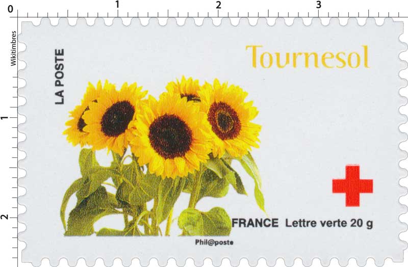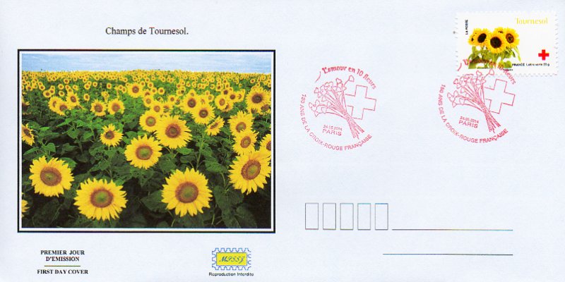 | Commentaire | 150e Anniversaire de la Croix-Rouge française Timbre à date “Premier Jour” conçu par Agence 1440 Publishing En savoir plus sur Wikipédia : Tournesol