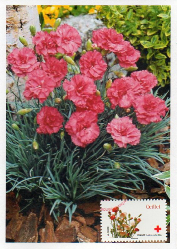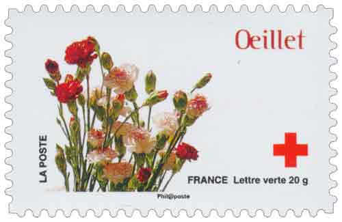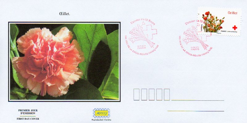 | Commentaire | 150e Anniversaire de la Croix-Rouge française Timbre à date “Premier Jour” conçu par Agence 1440 Publishing En savoir plus sur Wikipédia : Œillet |