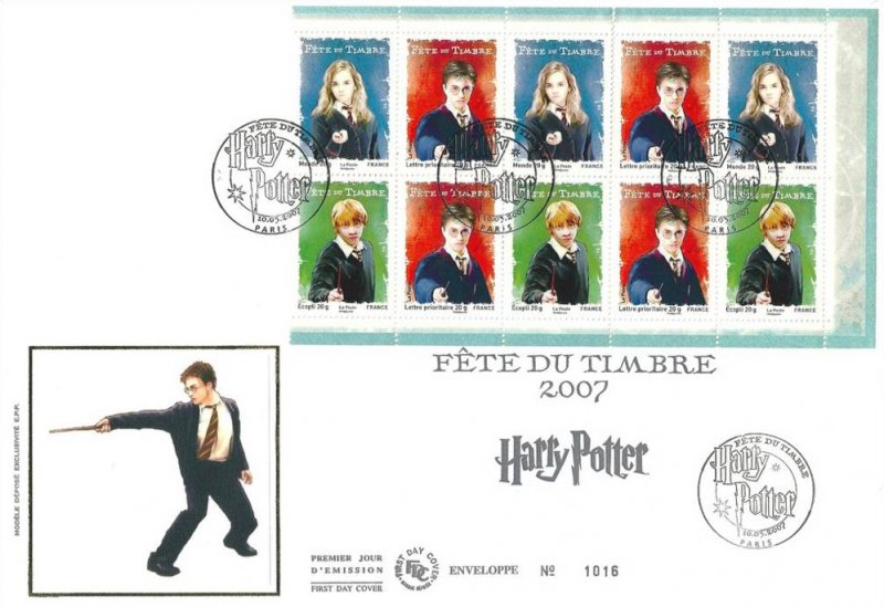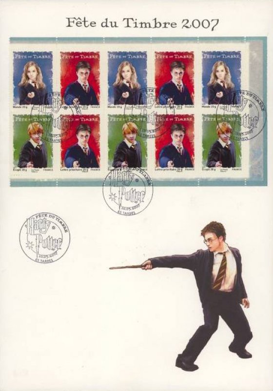| Description | FÊTE DU TIMBRE 2007 4 timbres n° 1 (Harry Potter rouge) 3 timbres n° 2 (Hermione bleu) 3 timbres n° 3 (Ron vert) |