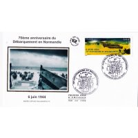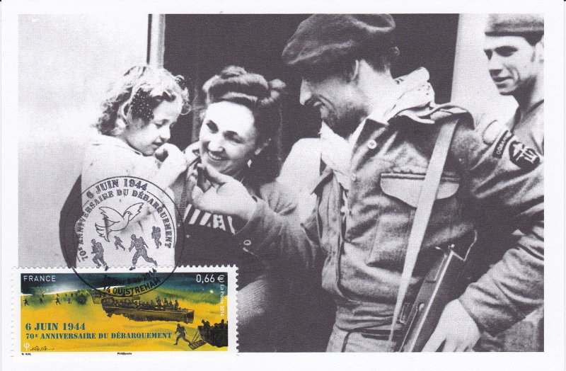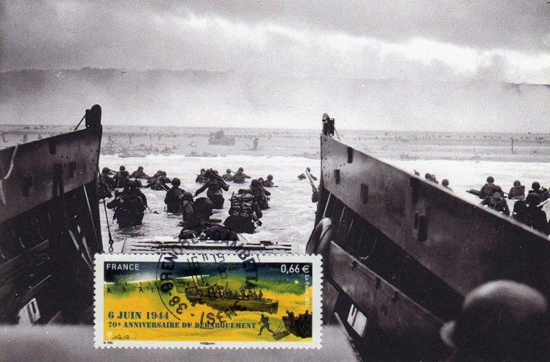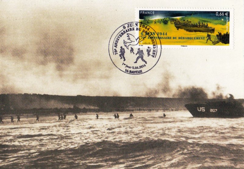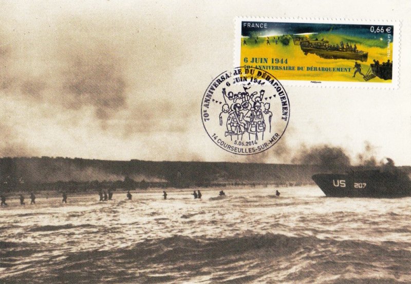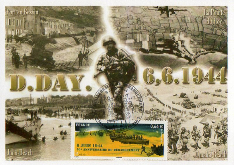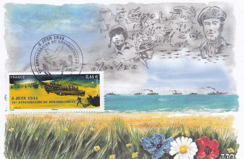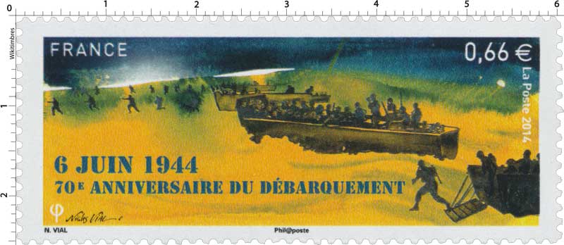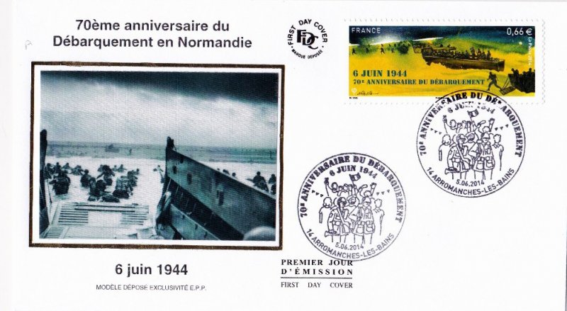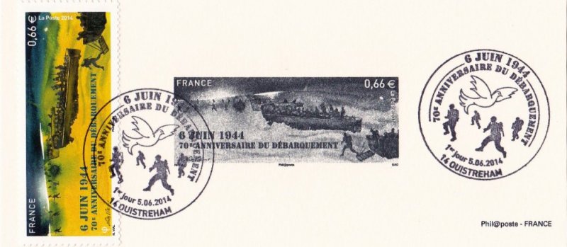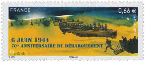 | Commentaire | En savoir plus sur Wikipédia : Bataille de Normandie Timbre à date "Premier jour" conçu par Aurélie Baras Imposition : 10 bandes de 4 TP En juin 2014, le 70e anniversaire du Débarquement en Normandie a eu un retentissement national et international. Ce fut un temps de recueillement qui a permis de rendre hommage aux hommes et femmes qui ont combattu le nazisme et rendu la liberté à l’Europe. Ce fut aussi probablement le dernier anniversaire décennal en présence des acteurs et des témoins de ces événements. Au moment d’accueillir pour la dernière fois dans le cadre d’un grand anniversaire un nombre encore important de celles et ceux qui sont les dépositaires du “souvenir vivant”, l’émotion a été intense. Cet anniversaire était aussi un moment privilégié pour la transmission de la mémoire et le partage des valeurs fondamentales pour lesquelles tant de jeunes hommes sont allés jusqu’au sacrifice suprême : la paix, la liberté, la fraternité, la dignité de l’Homme. C’était aussi l’occasion de transmettre et de sensibiliser les jeunes à notre histoire. |