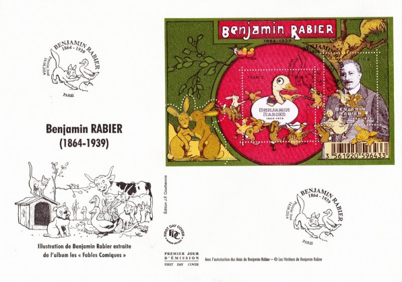 | Commentaire | En savoir plus sur Wikipédia : Benjamin Rabier TAD conçu par S. Coffinet Benjamin Rabier fut l’un des plus grands dessinateurs animaliers français, illustrateur notamment des Fables de La Fontaine, du Roman de Renart et de l’Histoire Naturelle de Buffon. Dès 1916, Il se lance avec son ami et complice Émile Cohl dans le dessin animé, puis dans la publicité. En 1921, Léon Bel s’inspire d’un dessin de Benjamin Rabier comme logo de sa marque “La vache qui rit”. Cette vache décore les camions de transport de viande fraîche pendant la Première Guerre mondiale et est surnommé la “Wachkyrie”. Mais son personnage de bande dessinée le plus célèbre reste Gédéon le canard, dont les histoires ont été publiées entre 1923 et 1939 en 16 albums. Il a aussi dessiné la célèbre baleine des Salins du Midi. Pour la cinémathèque Pathé Baby, il crée de 1922 à 1925, de nombreux dessins animés ayant pour sujets certains de ses personnages comme Gédéon. Ses oeuvres sont visibles au musée qui lui est consacré à La Roche-sur-Yon, sa ville de naissance. |