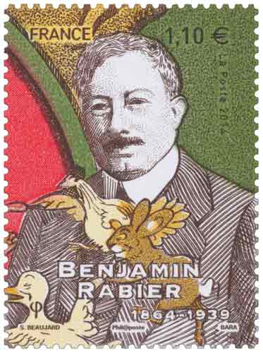| Commentaire | En savoir plus sur Wikipédia : Benjamin Rabier Une version adhésive de ce timbre est émise en sept. 2014 : voir le timbre Benjamin Rabier fut l’un des plus grands dessinateurs animaliers français, illustrateur notamment des Fables de La Fontaine, du Roman de Renart et de l’Histoire Naturelle de Buffon. Dès 1916, Il se lance avec son ami et complice Émile Cohl dans le dessin animé, puis dans la publicité. En 1921, Léon Bel s’inspire d’un dessin de Benjamin Rabier comme logo de sa marque “La vache qui rit”. Cette vache décore les camions de transport de viande fraîche pendant la Première Guerre mondiale et est surnommé la “Wachkyrie”. Mais son personnage de bande dessinée le plus célèbre reste Gédéon le canard, dont les histoires ont été publiées entre 1923 et 1939 en 16 albums. Il a aussi dessiné la célèbre baleine des Salins du Midi. Pour la cinémathèque Pathé Baby, il crée de 1922 à 1925, de nombreux dessins animés ayant pour sujets certains de ses personnages comme Gédéon. Ses oeuvres sont visibles au musée qui lui est consacré à La Roche-sur-Yon, sa ville de naissance. |