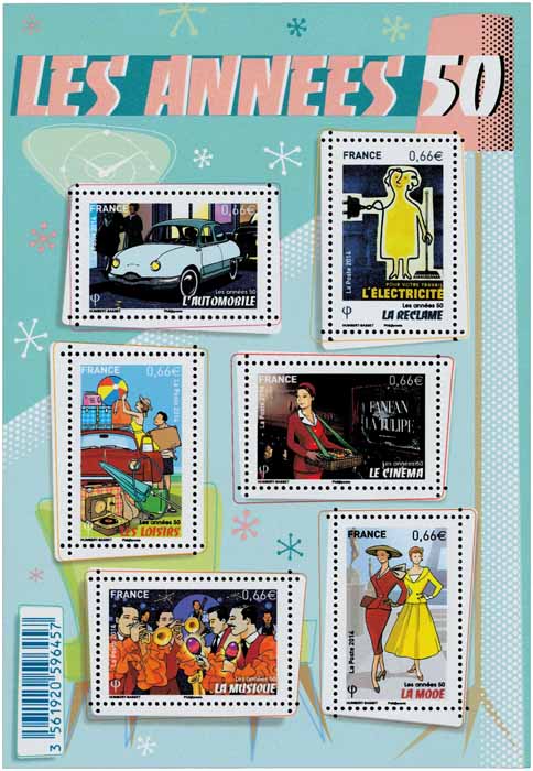 | Description | "Les années 50" bloc de six timbres à 0,66 € « L'automobile », « L'électricité », « Les loisirs », « Le cinéma », « La musique » et « La mode » |