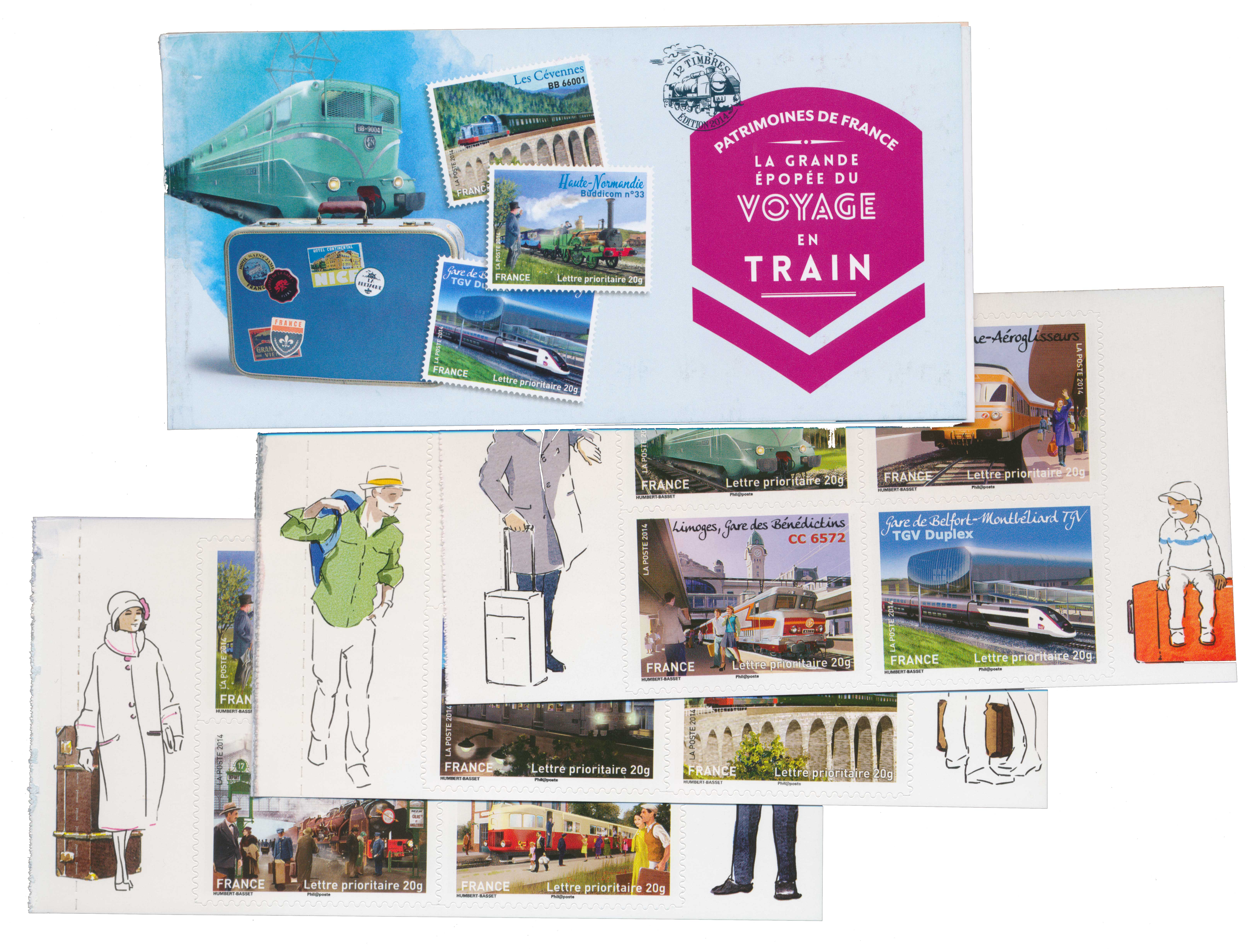 | Commentaire | La découverte du patrimoine ferroviaire de France Timbre à date “Premier Jour” conçu par S. Humbert-Basset Conçu par Stéphane Humbert-Basset, ce carnet de 12 timbres vous emmène à la découverte du patrimoine ferroviaire de France, à travers la grande épopée du voyage en train. De la Buddicom au TGV, les trains ont, dans leur pluralité, accompagné toutes les grandes étapes de l’histoire du chemin de fer de France. Ce carnet de timbres retrace donc l’évolution, au fi l des années, du voyage en train. |