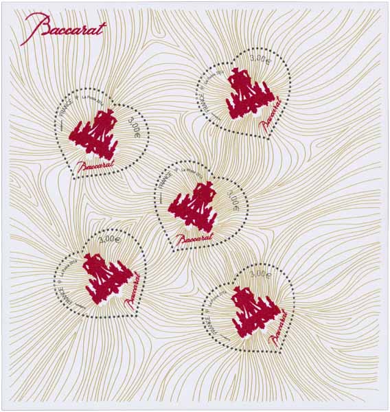 | Commentaire | Valeur faciale des timbres : 3,00 € Impression : Mixte taille-douce et sérigraphie avec poudre de cristal de Baccarat Fondée en Lorraine en 1764, sur autorisation du Roi Louis XV, la plus illustre Manufacture de cristal au monde a traversé les époques pour devenir un symbole d’excellence et d’Art de Vivre. Baccarat, un nom qui résonne comme l’écho de lieux extraordinaires, de fêtes inoubliables et de pièces d’exception. Les oeuvres prestigieuses de Baccarat, acclamées et récompensées à l’occasion des Expositions Universelles de Paris depuis 1867, illuminent toujours palais et lieux d’exception. Les créations Baccarat pérennisent l’élégance autant que l’excellence du savoir-faire. Un savoir-faire à l’avant-garde du progrès, transmis au fil des siècles par une élite d’artisans et reflet d’un héritage incomparable. Inspirés par les secrets d’alchimistes liés aux éléments, souffleurs, tailleurs, graveurs et doreurs mettent leur inimitable talent au service de la perfection. Chaque création incarne une promesse ultime, une expérience à vivre et avant tout à partager. Depuis 250 ans, Baccarat demeure plus que jamais le symbole d’un luxe inégalable et éternellement jeune, poursuivant sa vocation d’élite, à l’assaut des rêves, à la pointe de la modernité. Le timbre et le bloc sont imprimés en mixte taille-douce et sérigraphie. Pour la fabrication du Bloc Coeur Baccarat, le fond de couleur or et la perforation ont été faits en taille douce, puis le reste du bloc en sérigraphie. Pour la dépose du noir et du mélange de poudre de cristal et d’une encre rouge, l’impression en sérigraphie s’est faite sur la machine Sramag 628 : l’association de poudre de cristal et d’encre rouge a donné une encre épaisse ce qui a nécessité une trame plus grosse et donc un rendu spécifique. Il a fallu trouver un compromis pour obtenir un certain volume tout en gardant le détail des éléments : une impression correcte et brillante du fond et du motif, et un texte parfaitement lisible. |