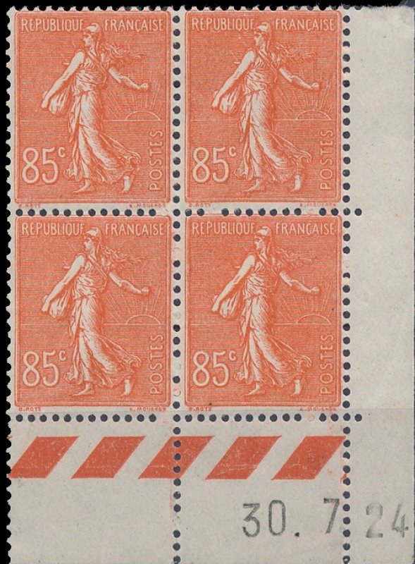 | Commentaire | Semeuse lignée. Nota Les ombres portées sur la Semeuse sont mal positionnées par rapport au soleil, de plus elle sème contre le vent Voir la vidéo "Histoires de timbres" Le 85 centimes rouge, type Semeuse lignée, référencé Yvert et Tellier n° 204, fait partie des dernières valeurs créées avant la révision tarifaire de 1926. Mis en vente dans la période 1924-1926 et retiré en décembre 1925, il appartient aux tirages relativement courts et moins courants de la série. Gravé par Louis-Eugène Mouchon d’après l’allégorie d’Oscar Roty, ce timbre reprend la figure emblématique de La Semeuse semant à contre-vent, posée sur le fond ligné avec soleil levant. Il est imprimé en typographie, dentelé 14 × 13½, au format standard 20 × 24 mm, et conditionné en feuilles de 100 timbres. Sa couleur rouge, spécifique à cette valeur faciale, facilite son identification au sein des multiples nuances de la série lignée. Le timbre reste plus recherché neuf que oblitéré, comme l’indique sa cote. |