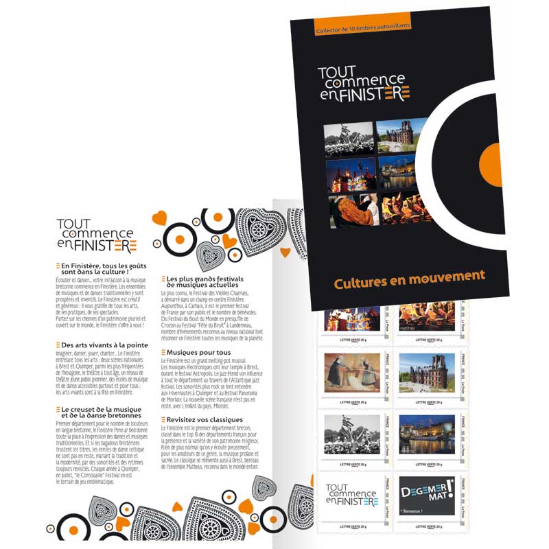 | Commentaire | Voir les précédents collectors En été, le Finistère est une terre de musique, de danse et de spectacles vivants… Musique classique, jazz, danses celtiques et bien sûr musiques actuelles y trouvent chaque année un accueil chaleureux et un public passionné. On ne saurait manquer les Vieilles Charrues, premier Festival de France par son audience, le Festival du Bout du monde, le Cornouailles Festival, l’Atlantique Jazz Festival et bien d’autres… Mais le Finistère fait aussi les beaux jours des amateurs de peinture, de cinéma, de théâtre de rue, sans oublier les arts et traditions populaires bretons. Les dix timbres-poste « lettre verte » sont un hommage au dynamisme culturel du département. |