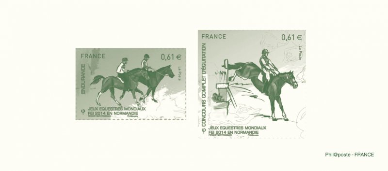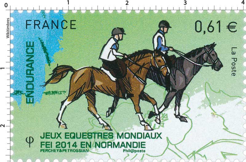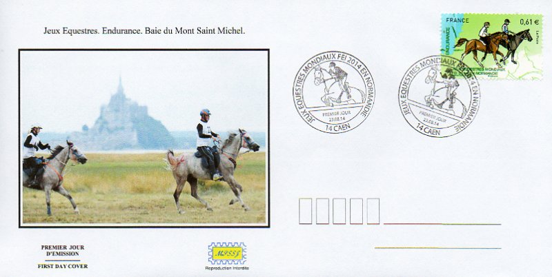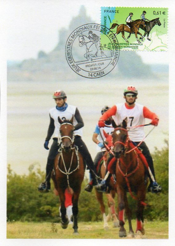 | Commentaire | Timbre à date “Premier Jour” conçu par B. Perchey et K. Petrossian En savoir plus sur Wikipédia : Jeux équestres mondiaux de 2014 |