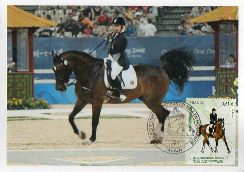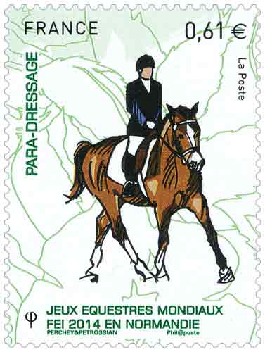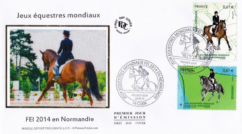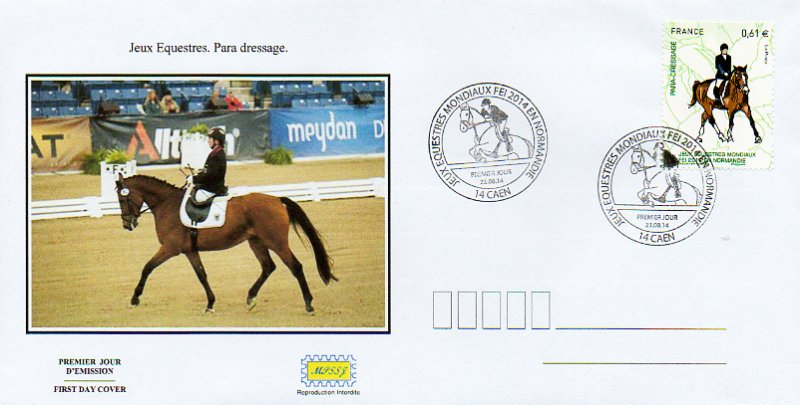 | Commentaire | Timbre à date “Premier Jour” conçu par B. Perchey et K. Petrossian En savoir plus sur Wikipédia : Jeux équestres mondiaux de 2014 |