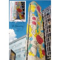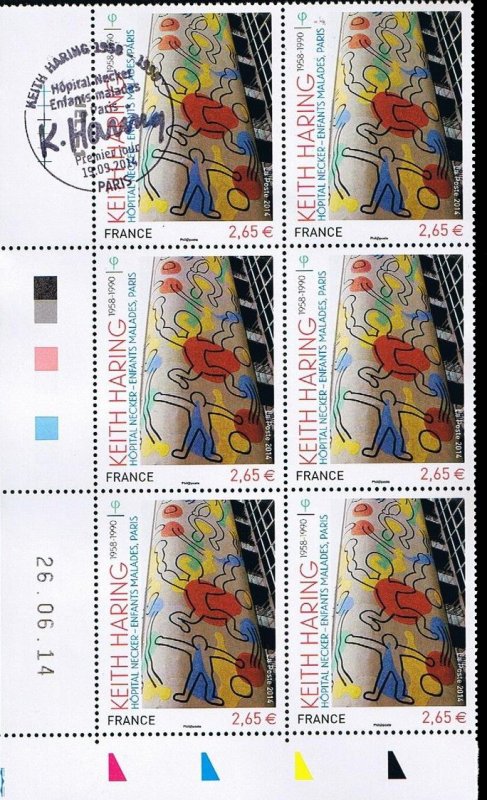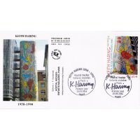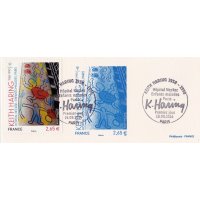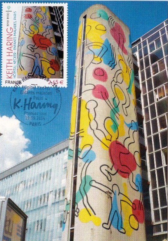| Commentaire | En savoir plus sur Wikipédia : Keith Haring Imposition : 10 bandes de 3 TP Timbre à date “Premier Jour” conçu par Stéphane Ghinéa Haring est l’un des artistes américains les plus marquants du pop art et du street art. Il a affirmé toute sa vie sa volonté de mettre l’art à la portée de tous. Son style est reconnaissable par ses silhouettes soulignées de noir, mêlées à des couleurs vives. L’immense fresque de 27 mètres de haut réalisée en 1987 sur la cage d’escalier de secours du bâtiment de chirurgie pédiatrique de l’hôpital Necker à Paris, est la seule oeuvre monumentale en extérieur de Keith Haring en France. Elle traduit l’engagement de l’artiste pour les enfants et contre la maladie. Symbole de vie, de joie et d’espoir, la fresque représente des silhouettes en mouvement qui incarnent par leurs lignes joyeuses mêlées à des grands aplats colorés, l’énergie et la volonté de vivre. La rénovation et la transformation de la structure générale de l’hôpital Necker posèrent il y a quelques années la question de la pérennité de cette oeuvre. Entre juin 2011 et 2013 l’hôpital Necker, la Fondation Keith Haring et son galeriste parisien Jérôme de Noirmont se sont employés à réunir les fonds nécessaires auprès de mécènes pour financer ces travaux, qui débuteront en 2015. |
