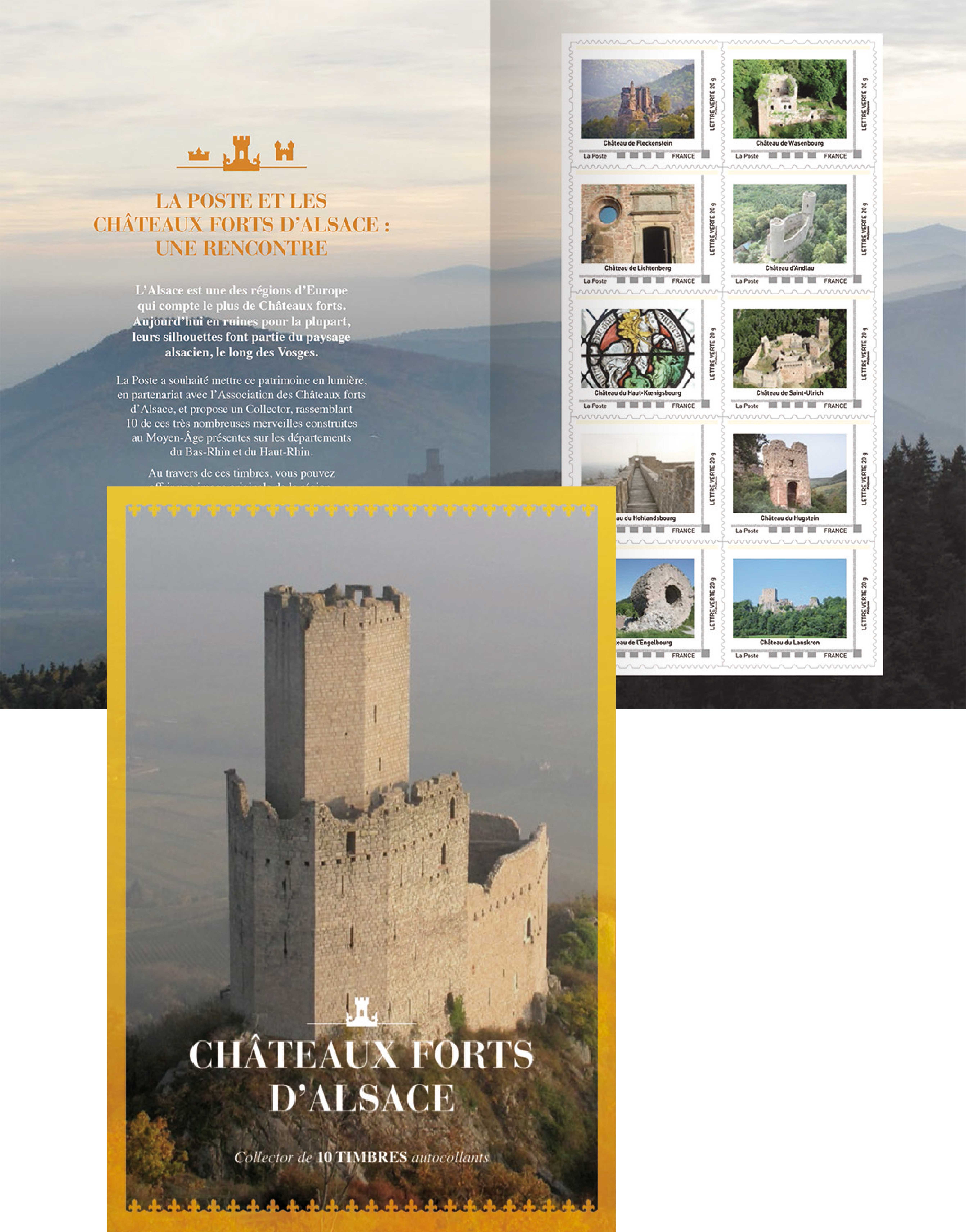 | Commentaire | L’Alsace est une des régions d’Europe qui compte le plus de châteaux forts. Aujourd’hui en ruines pour la plupart, leurs silhouettes font partie du paysage. La Poste a souhaité mettre ce patrimoine en lumière, en partenariat avec l’Association des Châteaux forts d’Alsace, et propose un collector, rassemblant 10 de ces très nombreuses merveilles construites au Moyen-Âge présentes sur les départements du Bas-Rhin et du Haut-Rhin. Au travers de ces timbres, vous pouvez offrir une image originale de la région, et de sa riche histoire qui nous contemple. |