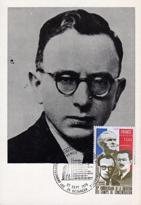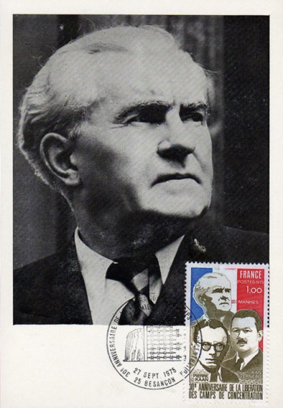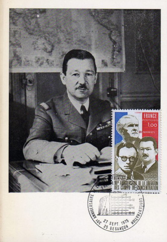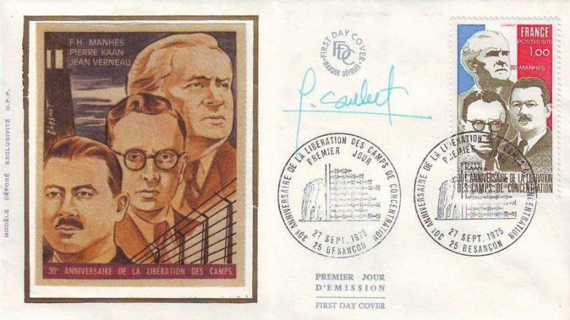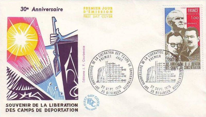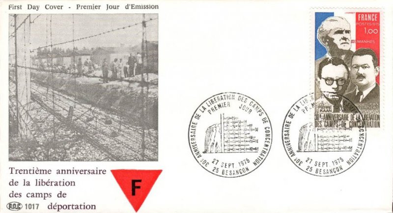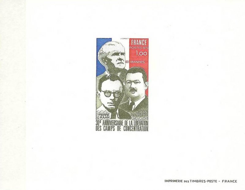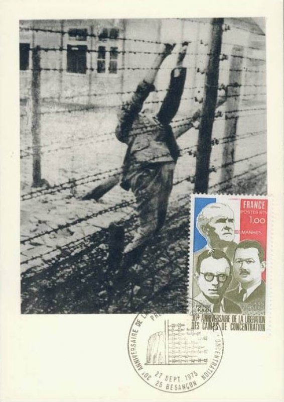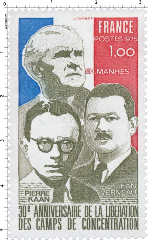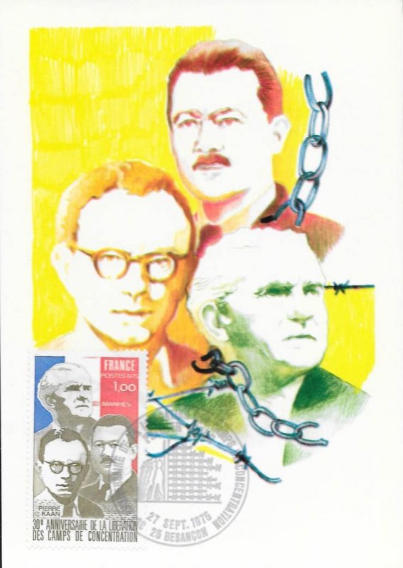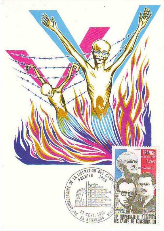 | Description | 30e anniversaire de la libération des camps de concentration. Pierre Kaan, F.H. Manhès et Jean Verneau. Oblitération 1er jour Besançon |