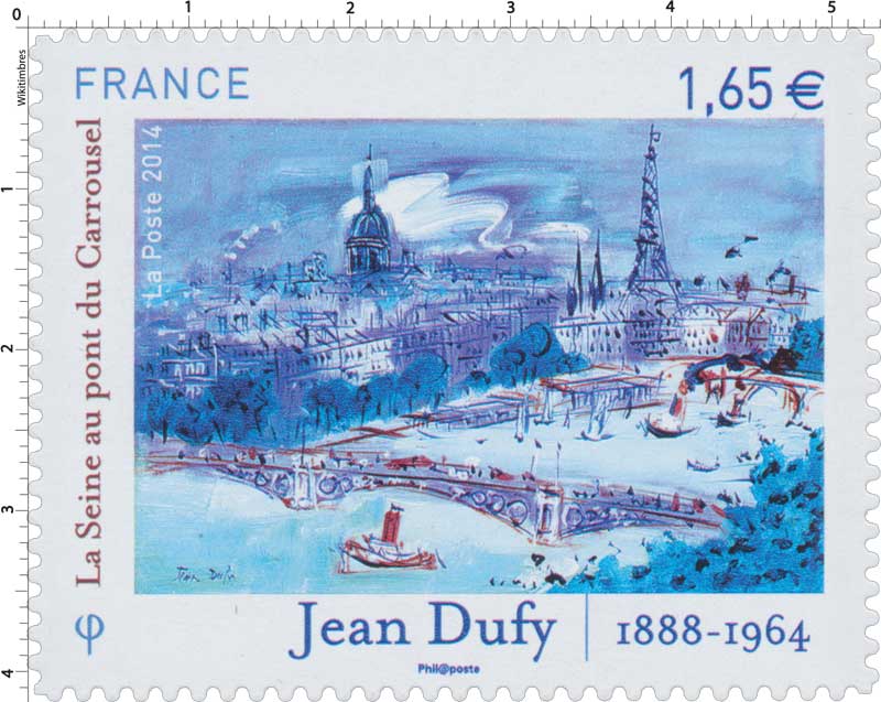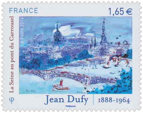 | Commentaire | En savoir plus sur Wikipédia : Jean Dufy Visuel : Jean DUFY "La Seine au pont du Carrousel" Huile sur toile 38 x55cm Timbre gommé émis lors du salon en juin 2014 : voir ce timbre Moins universellement connu que son frère Raoul, Jean Dufy (1888-1964) fut le peintre de la couleur et de la ville : ses oeuvres hautement colorées, vivantes, rythmées et pimpantes racontent les ports de Normandie et de Méditerranée, Paris et ses monuments - sur ce timbre, la Seine au pont du Carrousel - ses jardins, ses spectacles... la ville regardée comme on aime une personne, dans ses détails et son quotidien. Jean Dufy a beaucoup voyagé, beaucoup exposé. Il a côtoyé Apollinaire, Braque, Picasso, Derain. Il a rencontré aussi Erik Satie, Darius Milhaud, Francis Poulenc. C’est peut-être ce qui explique le côté “musical” de sa peinture toute en douceur et en liberté. Jean Dufy n’a cessé tout au long de sa vie, de témoigner son attachement à Paris, la ville lumière dont il explore, peint ou dessine les contours. “La Seine au pont du Carrousel”, magnifique toile au ton monocolore où monuments, façades, ciel et fleuve se confondent, illustrent le timbre qui rend hommage à Jean Dufy. |