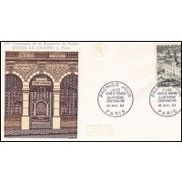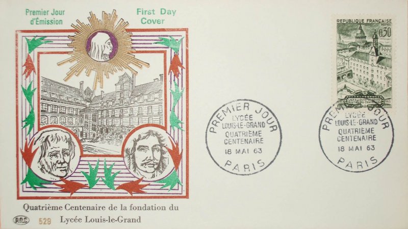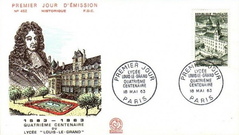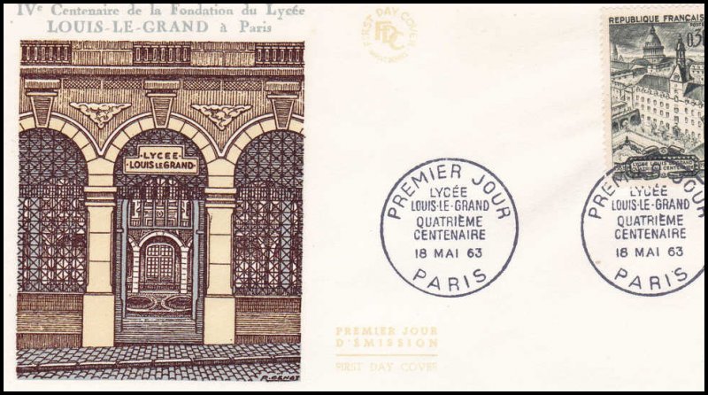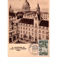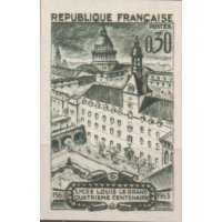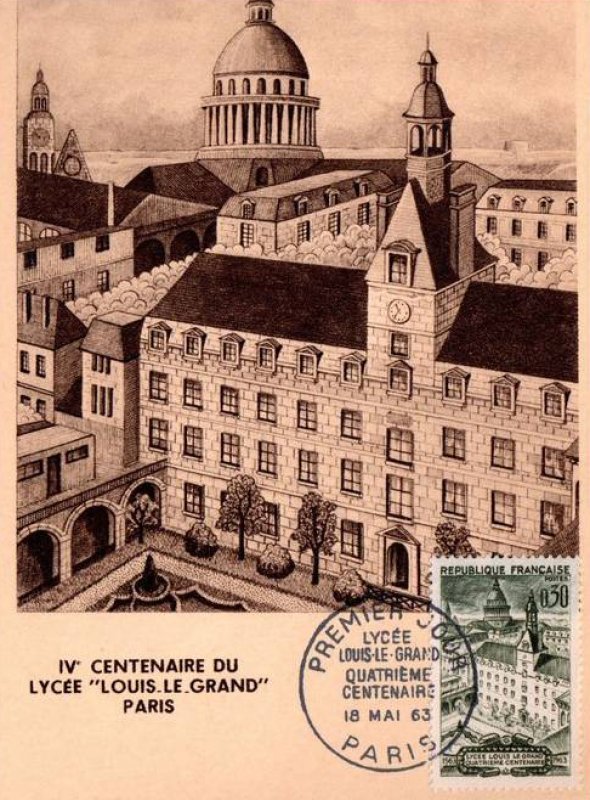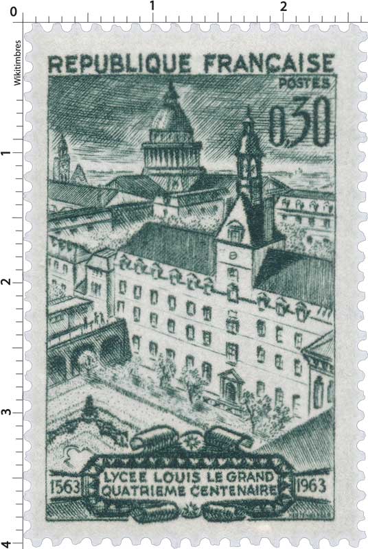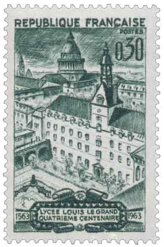 | Commentaire | Le timbre émis en mai 1963 pour célébrer le quatrième centenaire du lycée Louis-le-Grand offre bien plus qu’un hommage à un établissement scolaire : il cristallise une part de l’histoire intellectuelle de la France. Le visuel, conçu et gravé par Claude Hertenberger, met en scène l’entrée monumentale du lycée, flanquée de colonnes classiques, avec en arrière-plan une élégante suggestion d’architecture haussmannienne. La composition, à la fois dense et aérée, évoque à la fois la stabilité de l’institution et son rayonnement dans la capitale. Fondé en 1563 sous le nom de Collège de Clermont par les jésuites, l’établissement deviendra lycée Louis-le-Grand en 1805, sous l’Empire, et s’imposera rapidement comme un haut lieu de formation de l’élite républicaine. Au fil des siècles, il a accueilli une impressionnante lignée d’écrivains, de scientifiques, de philosophes et d’hommes politiques — de Voltaire à Pompidou, en passant par Hugo, Sartre ou Jaurès. Ce timbre ne les représente pas, mais leur présence imprègne chaque pierre du bâtiment qu’il illustre. Le choix de La Poste de commémorer ce lieu en 1963 est révélateur : à une époque où l’éducation devient un enjeu majeur de société, il s’agit de rappeler l’héritage d’excellence et de rigueur porté par cet établissement. Hertenberger, avec son style net et structuré, restitue dans une gravure en vert profond la solennité du lieu sans tomber dans la froideur. Il saisit une atmosphère plus qu’un monument : celle d’un bastion du savoir, ancré dans l’histoire, tourné vers l’avenir. Discret mais évocateur, ce timbre trouve une place particulière dans les collections philatéliques : il ne parle pas seulement d’un bâtiment, mais de ce qu’il incarne depuis quatre siècles. ©WikiTimbres |