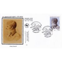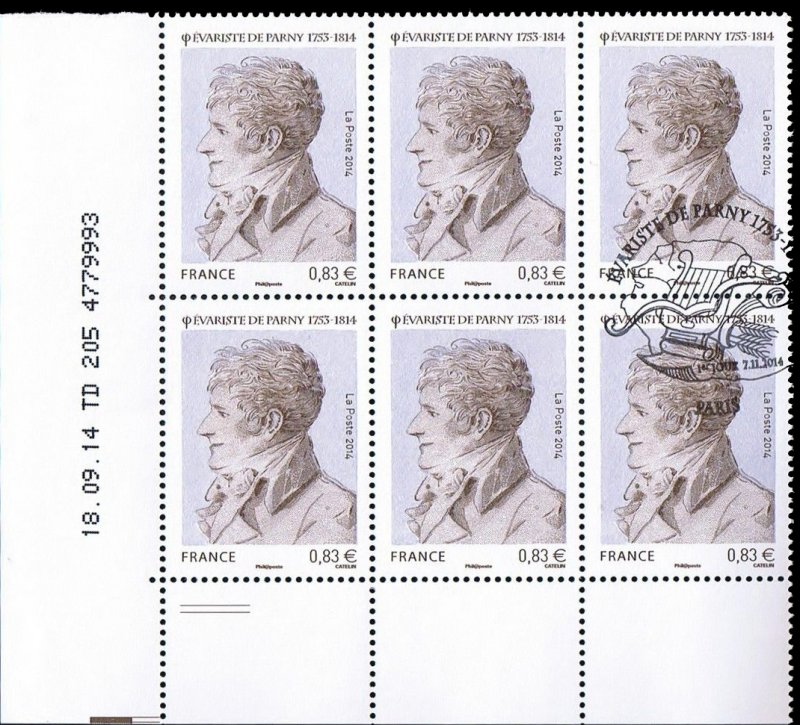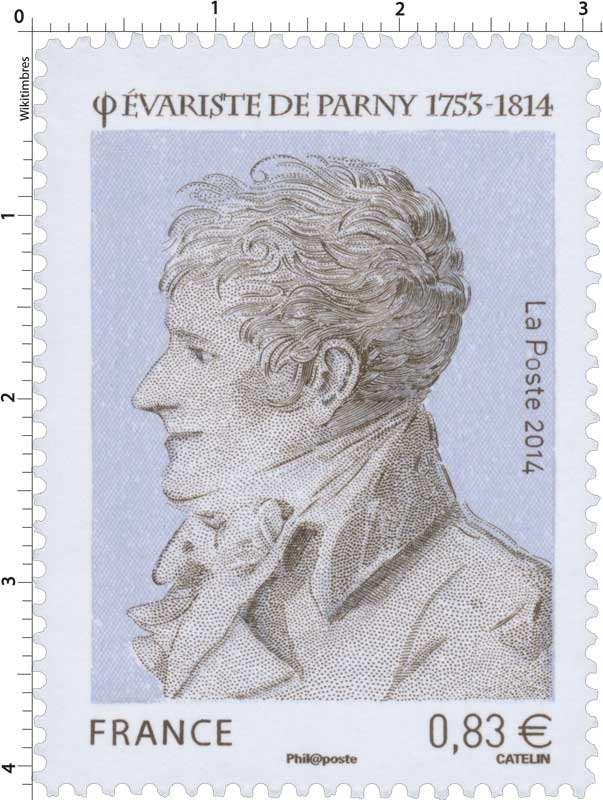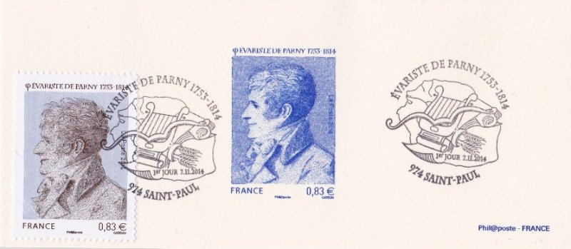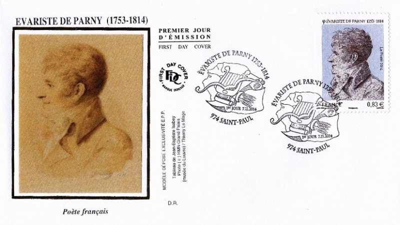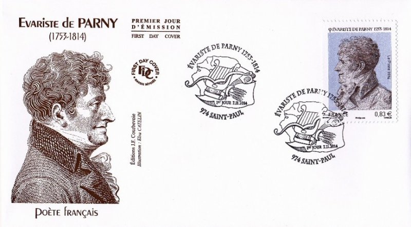 | Commentaire | Timbre à date “Premier Jour” conçu par Elsa Catelin Imposition : 6 bandes de 8 TP En savoir plus sur Wikipédia : Évariste de Parny Poète français, Évariste de Parny est né en 1753 à Saint-Paul de l’île Bourbon. Il est, avec Antoine Bertin, un des premiers poètes réunionnais. Tous deux partent en 1763 étudier à Rennes, où ils fonderont, quelques années plus tard, au sein de la garde du roi, “La Caserne”, sorte de repères de poètes. De retour à La Réunion, il écrit les Poésies érotiques, son oeuvre la plus connue, inspirée par une liaison avec une jeune fille à qui il donne des cours, liaison rendue impossible par son père. Dès la publication du recueil en 1778, Voltaire dit son admiration pour le poète, l’appelant Tibulle, du nom du poète latin, auteur d’élégies amoureuses. En 1785, un voyage en Inde lui inspire les Chansons madécasses, pamphlet anticolonialiste en prose qui oppose l’hospitalité des africains, leurs rituels religieux, militaires, amoureux, à la traite négrière des blancs. Il publie en 1799 un texte qui fera scandale, La Guerre des dieux : une critique virulente de la religion dominante, de son clergé et de certains de ses dogmes. En 1803, à cinquante ans, Évariste de Parny est élu à l’Académie française. Il meurt en 1814 à Paris. |