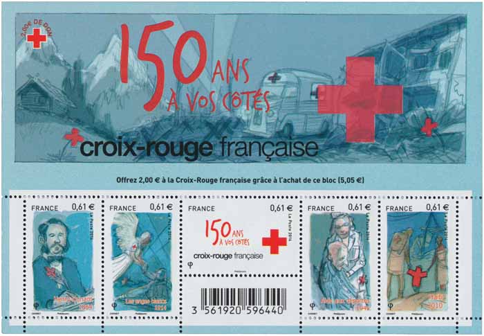 | Commentaire | En savoir plus sur Wikipédia : la Croix-Rouge française En 2014, La Poste et la Croix-Rouge française ont décidé de confier la réalisation du bloc à Sylvain Chomet, dessinateur, scénariste de bande dessinée et réalisateur de films d’animation français, dont Les Triplettes de Belleville et L’Illusionniste. Solidaire et symbolique, ce bloc célèbre les 100 ans du partenariat entre La Poste et la Croix-Rouge française : c’est en effet le 11 août 1914, face aux souffrances de la guerre, que Raymond Poincaré, président de la République, signe le décret autorisant l’administration postale à émettre le premier timbre à “surtaxe”. Le bloc marque aussi le 150e anniversaire de la Croix-Rouge française. Depuis 1864, la Croix-Rouge française intervient sur tous les fronts de l’urgence et du secourisme et accompagne l’évolution sanitaire et médico-sociale du pays en portant toujours la plus grande attention à ceux qu’elle aide. Pour chaque bloc acheté, 2€ sont reversés à la Croix-Rouge française. Ce don permet par exemple à l’association d’offrir deux repas complets ou de distribuer six couvertures de survie. |