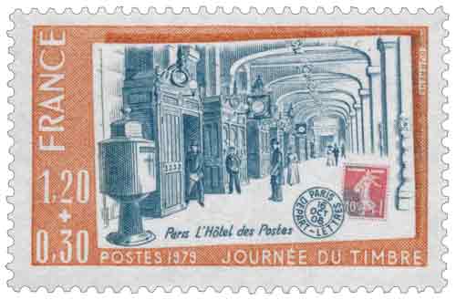 | Commentaire | Ce timbre s’insère dans la longue tradition des émissions consacrées à la Journée du Timbre, rendez-vous annuel destiné à promouvoir la philatélie et à renforcer les liens entre La Poste et le réseau associatif des collectionneurs. En 1979, le choix du sujet se porte sur l’Hôtel des Postes de Paris, bâtiment emblématique de l’histoire postale française situé rue du Louvre, dont la fonction centrale remonte au XVIIIᵉ siècle. Ce timbre évoque non seulement un lieu, mais aussi l’évolution des services postaux à l’ère de l’industrialisation et de la modernisation administrative. L’édifice représenté est celui reconstruit à la fin du XIXᵉ siècle par l’architecte Julien Guadet, figure majeure de l’architecture publique, qui combina structure métallique et habillage de pierre afin de répondre aux exigences fonctionnelles d’un trafic postal en pleine expansion. Ce timbre reprend l’esthétique d’une carte postale ancienne, volontairement inspirée de documents photographiques du début du XXᵉ siècle, soulignant le caractère documentaire et patrimonial de l’émission. Le décor architectural, dominé par le portique d’abri et les arcades monumentales, rappelle le rôle central de Paris dans l’organisation postale nationale et internationale. Par son iconographie, ce timbre témoigne également du regard porté en 1979 sur le patrimoine des Postes, à un moment où l’histoire des services publics devient un thème récurrent de la politique commémorative française. Associé à une surtaxe au profit de la Croix-Rouge française, ce timbre illustre enfin la double vocation traditionnelle des Journées du Timbre : culturelle et solidaire. Article rédigé pour WikiTimbres |