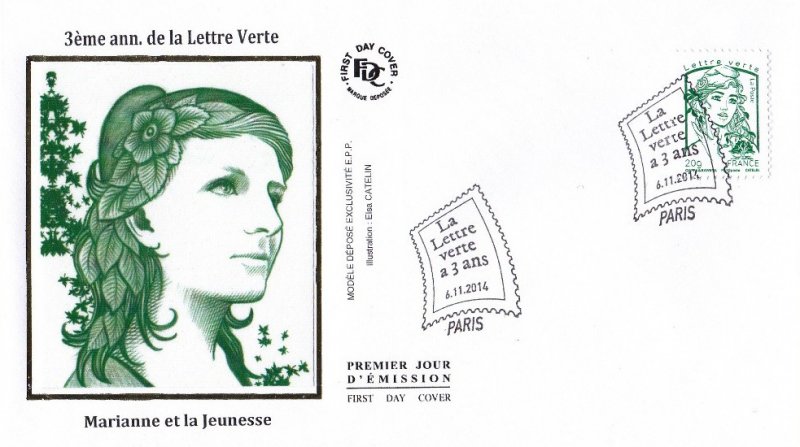 | Commentaire | Conception graphique de la couverture : Stéphanie Guinéa Ce carnet est composé de 3 feuillets : la couverture (dos) à droite, un feuillet de 2 TP et un feuillet de 12 TP Avec la Lettre verte, La Poste s’inscrit dans le champ de la participation bénéfique au développement durable. Le timbre vert existe depuis le 1er octobre 2011 et coûtait 0,57€ lorsqu’il est arrivé sur le marché, c’est-à-dire un prix intermédiaire au sein de la tarification en vigueur. Il s’agissait pour La Poste de privilégier des modes d’acheminement moins polluants et plus doux pour l’environnement, comme peut l’être le train vis-à-vis de l’avion. À cette époque, une lettre de vingt grammes livrée sous quatre jours France métropolitaine, coûtait 0,55 € et 0,60 € pour une livraison sous vingt-quatre heures. Hormis pour les espaces insulaires de la Corse et des DOM-TOM, le courrier affranchi du timbre vert circule par voies ferroviaires. |
