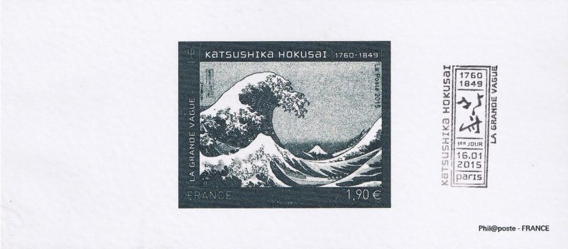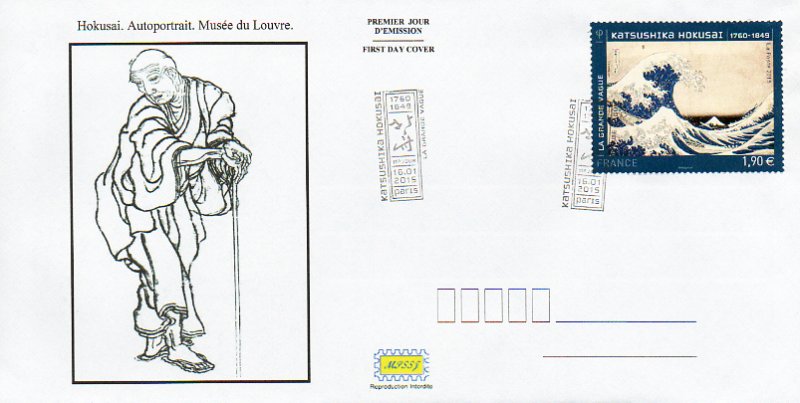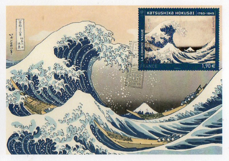 | Commentaire | En savoir plus sur Wikipédia : Hokusai Timbre à date “Premier Jour” conçu par Valérie Besser Katsushika Hokusai naît à Edo (aujourd’hui Tokyo) en 1760 et meurt le 10 mai 1849. Il est l’un des artistes japonais les plus connus au monde. Ce “fou de peinture” comme il se définit lui-même, est à la fois peintre, graveur et dessinateur. En 1831, il réalise une des oeuvres les plus connues de l’histoire de l’art : l’estampe La Grande Vague de Kanagawa, première de la série des 36 vues du mont Fuji. Dès le milieu du XIXe siècle, les estampes de Hokusai connaissent un succès phénoménal en Europe, notamment à la suite de l’Exposition universelle de Londres en 1862. Les peintres impressionnistes se passionnent pour cet art venu d’Extrême Orient : Claude Monet, en particulier, possède dans sa maison de Giverny une importante collection d’estampes japonaises de Hokusai et de Hiroshige. Plusieurs versions de La vague sont dispersées dans différents musées. Le timbre est réalisé d’après l’oeuvre conservée au musée Guimet. |