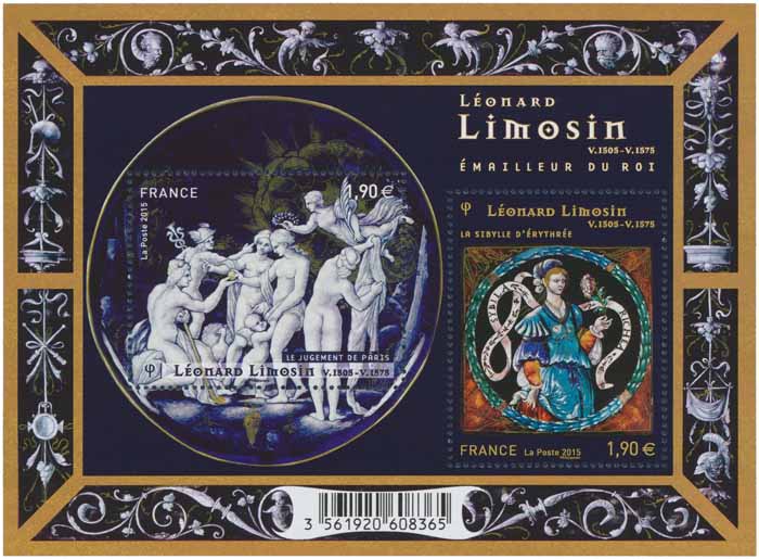 | Commentaire | En savoir plus sur Wikipédia : Léonard Limosin Timbre à date “Premier Jour” conçu par S. Patte & T. Besset Léonard Limosin est né vers 1505 à Limoges, ville qui avait vu, depuis le Moyen-Âge, prospérer les artisans d’art, et particulièrement les orfèvres et les émailleurs. Il apprend l’émaillage dans un atelier local. Son travail est remarqué par l’Évêque de Limoges et il entreprend dès lors une longue série d’émaux sur cuivre sur des thèmes religieux et mythologiques. Plus de mille pièces seront ainsi produites jusqu’en 1574. Outre ces sujets “sacrés”, il réalise de nombreuses plaques émaillées pour la galerie de François Ier à Fontainebleau. En 1548, il est nommé valet de chambre et émailleur du roi. Il va dès lors peindre de nombreux portraits de membres de la famille royale, mais aussi un superbe retable en émail, de plus d’un mètre de haut, représentant la Crucifixion et la Résurrection. Mort vers 1575, son influence sur la peinture sur émail se prolongera jusqu’à la fin du XVIIe siècle. |