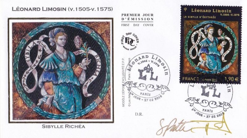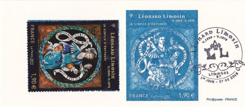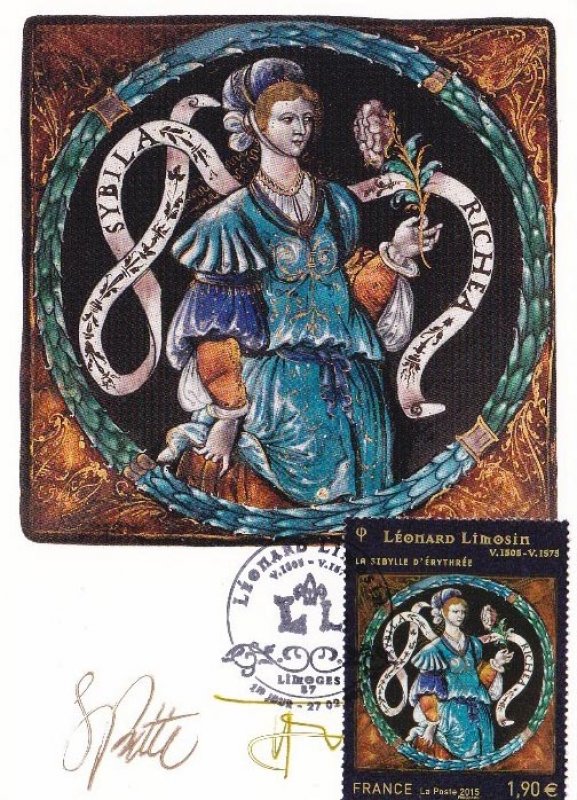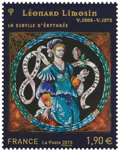 | Commentaire | En savoir plus sur Wikipédia : Léonard Limosin Erreur sur la légendre du timbre : Non pas "La Sibylle d'Erythrée de Léonard LIMOSIN" Mais plutôt "Sibylle Richea de Léonard Limosin vers 1535–1540" Comme l'indique le parchemin à droite du personnage "Richea" Léonard Limosin est né vers 1505 à Limoges, ville qui avait vu, depuis le Moyen-Âge, prospérer les artisans d’art, et particulièrement les orfèvres et les émailleurs. Il apprend l’émaillage dans un atelier local. Son travail est remarqué par l’Évêque de Limoges et il entreprend dès lors une longue série d’émaux sur cuivre sur des thèmes religieux et mythologiques. Plus de mille pièces seront ainsi produites jusqu’en 1574. Outre ces sujets “sacrés”, il réalise de nombreuses plaques émaillées pour la galerie de François Ier à Fontainebleau. En 1548, il est nommé valet de chambre et émailleur du roi. Il va dès lors peindre de nombreux portraits de membres de la famille royale, mais aussi un superbe retable en émail, de plus d’un mètre de haut, représentant la Crucifixion et la Résurrection. Mort vers 1575, son influence sur la peinture sur émail se prolongera jusqu’à la fin du XVIIe siècle. |