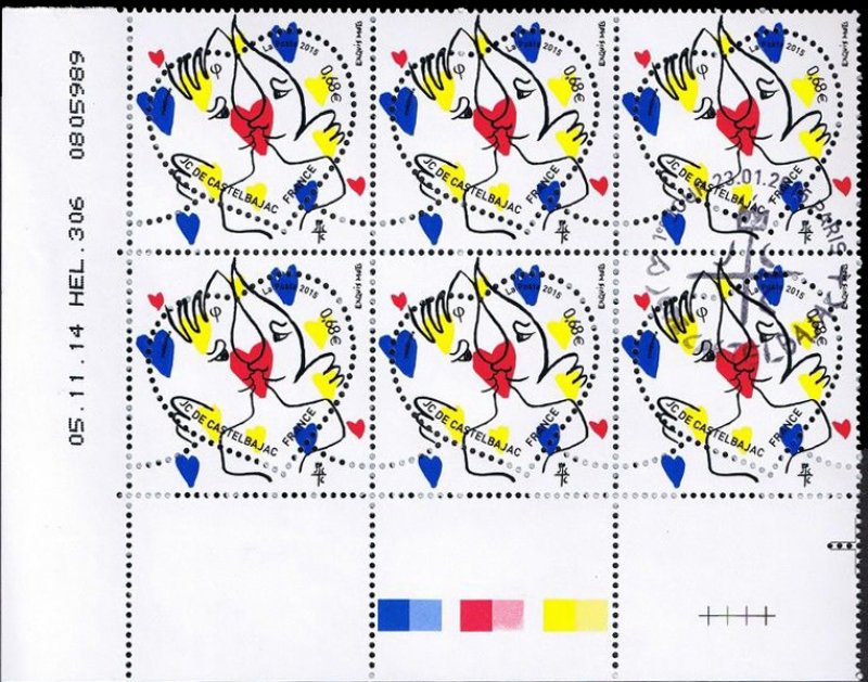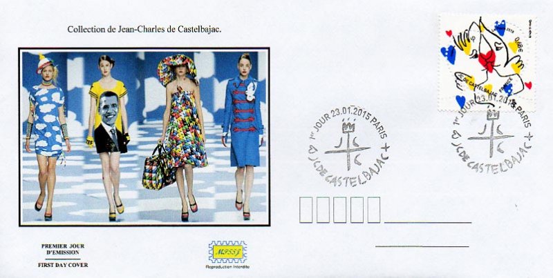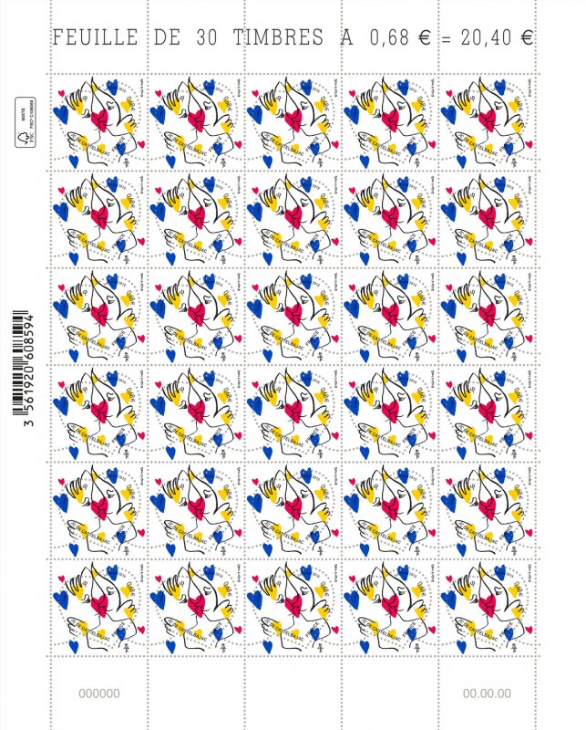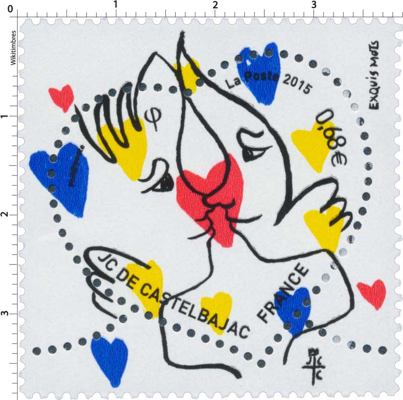 | Commentaire | Timbre à date “Premier Jour” conçu par Aurélie Baras Imposition : 6 bandes de 5 TP En savoir plus sur Wikipédia : Jean-Charles de Castelbajac Depuis 2000, La Poste confie la création de sa série de beaux timbres en forme de coeur à des créateurs français prestigieux de l’univers du luxe ou de la haute couture. Après la maison Baccarat en 2014, voici l’univers esthétique et coloré de Jean-Charles de Castelbajac. Créateur de mode, amoureux de l’écriture et du plaisir d’écrire, il a imaginé deux timbres d’amour : un timbre avec un décor de coeur et un avec un baiser sur fond d’étoiles. Les teintes emblématiques du créateur, bleu, jaune et rouge, symbolisent son univers : les amoureux sont entourés de petits coeurs (timbre lettre de 20 g) ou de petites étoiles (timbre courrier de 50 g). Pour les dessiner, le créateur s’est remémoré le premier baiser qui l’a fait rêver… un baiser d’esquimau ! Jean-Charles de Castelbajac a conçu avec poésie ces timbres coeur qui transmettront les “exquis mots” des amoureux lors de la prochaine Saint Valentin. |