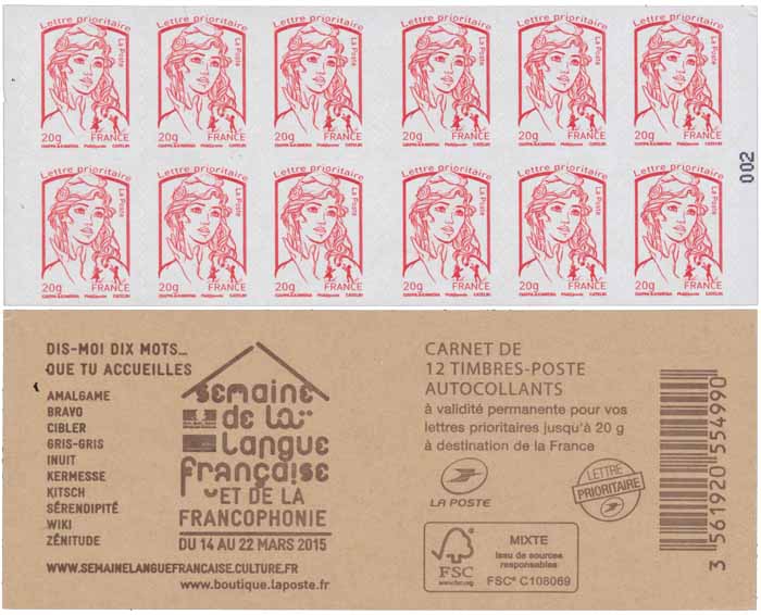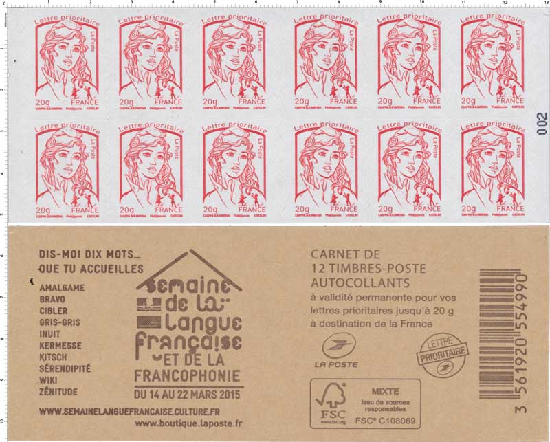 | Description | Carnet de 12 timbres autoadhésifs avec publicité "Semaine de la langue française" |