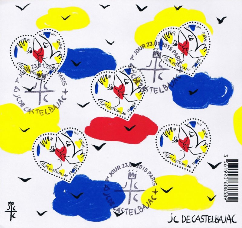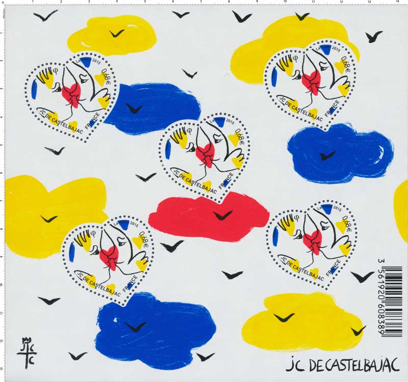| Commentaire | Timbre à date “Premier Jour” conçu par Aurélie Baras En savoir plus sur Wikipédia : Jean-Charles de Castelbajac Depuis 2000, La Poste confie la création de sa série de beaux timbres en forme de coeur à des créateurs français prestigieux de l’univers du luxe ou de la haute couture. Après la maison Baccarat en 2014, voici l’univers esthétique et coloré de Jean-Charles de Castelbajac. Créateur de mode, amoureux de l’écriture et du plaisir d’écrire, il a imaginé deux timbres d’amour : un timbre avec un décor de coeur et un avec un baiser sur fond d’étoiles. Les teintes emblématiques du créateur, bleu, jaune et rouge, symbolisent son univers : les amoureux sont entourés de petits coeurs (timbre lettre de 20 g) ou de petites étoiles (timbre courrier de 50 g). Pour les dessiner, le créateur s’est remémoré le premier baiser qui l’a fait rêver… un baiser d’esquimau ! Jean-Charles de Castelbajac a conçu avec poésie ces timbres coeur qui transmettront les “exquis mots” des amoureux lors de la prochaine Saint Valentin. |