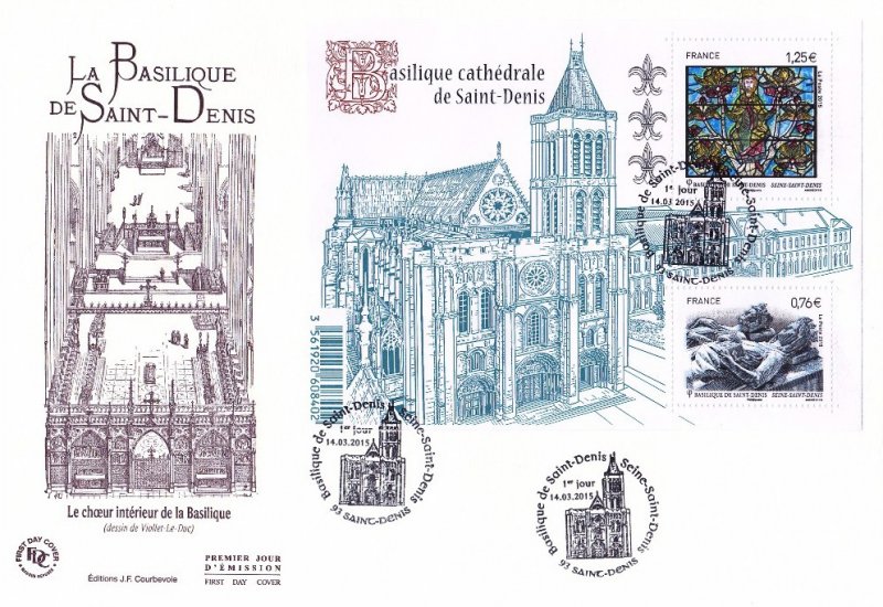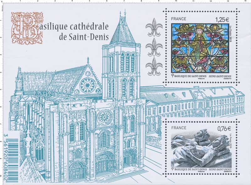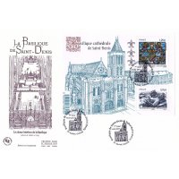 | Commentaire | En savoir plus sur Wikipédia : Basilique Saint-Denis Timbre à date “Premier Jour” conçu par Claude Perchat Chef-d’oeuvre monumental de l’art gothique, avec ses vitraux des XIIe et XIXe siècles, nécropole royale depuis le Moyen-Âge rassemblant une collection unique de 70 gisants et de tombeaux sculptés, l’église abbatiale est élevée, selon la tradition, par Sainte Geneviève à la fi n du Ve siècle sur le lieu de sépulture de saint Denis, martyrisé vers 250. Devenue basilique, elle est agrandie au XIIe siècle sous l’impulsion de l’abbé Suger. En 1793, les révolutionnaires s’attaquent aux symboles de la monarchie mais la basilique échappe à la destruction. Elle est restaurée au XIXe siècle par Debret, puis par Viollet-le-Duc. Classée au titre des monuments historiques, elle devient en 1966 cathédrale, siège de l’évêché de Saint-Denis. |
