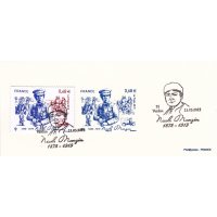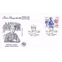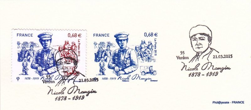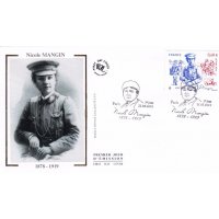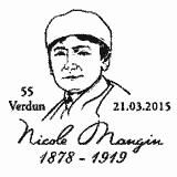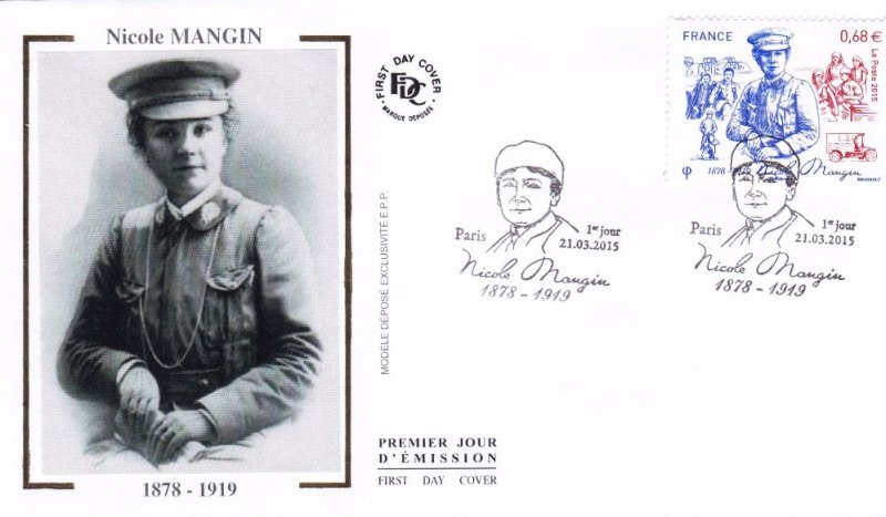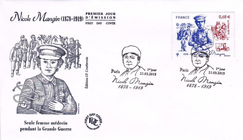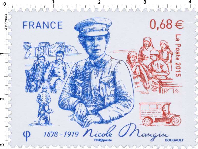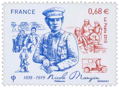 | Commentaire | En savoir plus sur Wikipédia : Nicole Mangin Timbre à date “Premier Jour” conçu par S. Bougault Nicole Girard-Mangin fut la seule femme médecin engagée sous les drapeaux pendant la Première Guerre mondiale. Née en 1878 dans la petite bourgeoisie parisienne elle reprend, après un divorce, ses études de médecine. Quand la guerre éclate en 1914, elle se porte volontaire pour soigner les soldats sur le front. L’administration militaire croyant nommer un docteur Gérard Mangin, elle est affectée au secteur de Verdun. À la fin de février 1916, elle prend la tête d’un convoi de soldats malades ou blessés, bravant le déluge de feu. Jusqu’à la fin de la guerre, Nicole Girard-Mangin se voue au soin des soldats, opérant sous des tentes de fortune ou parcourant les champs de bataille pour prodiguer les premiers soins aux blessés. Nicole Girard-Mangin est retrouvée morte le 6 juin 1919 à son domicile parisien. Les poilus reconnaissants lui font élever une stèle, apportant à cette pionnière l’hommage de “ceux qui lui doivent la santé, ceux qui lui doivent la vie, ceux qui lui doivent l’honneur”. (D’ap. Jean-Yves Le Naour). |