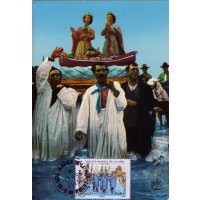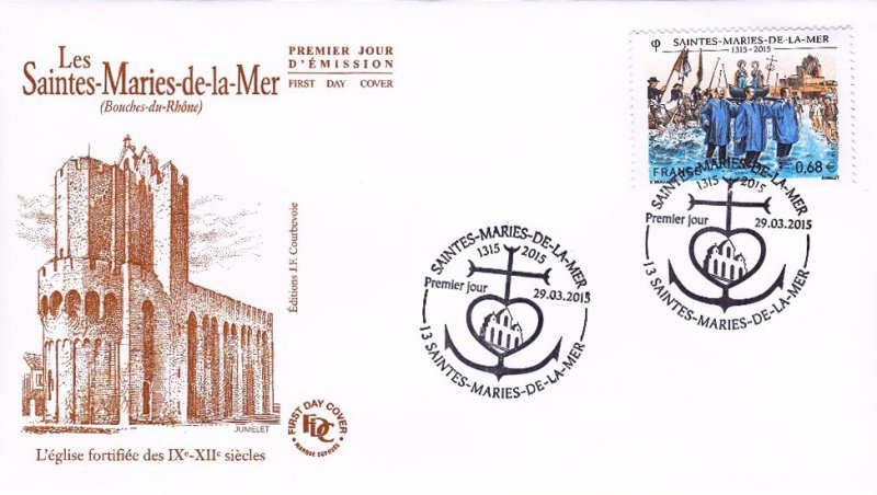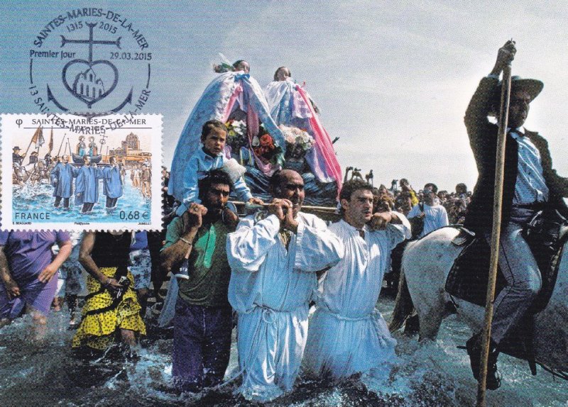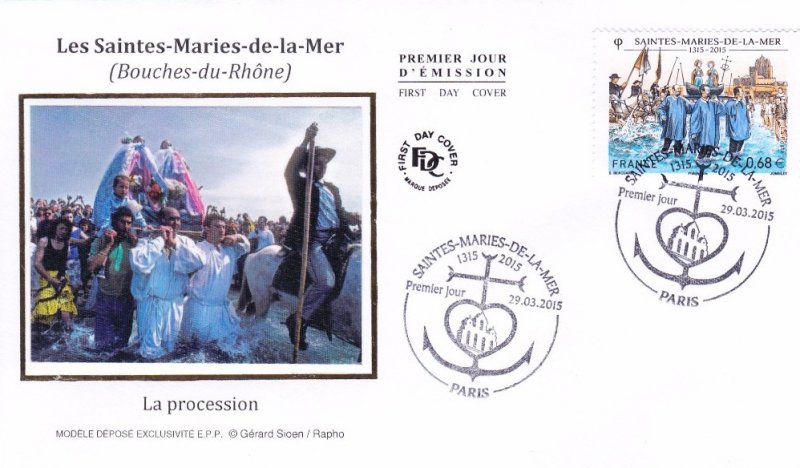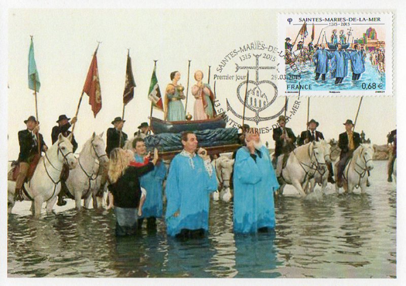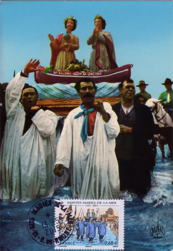 | Commentaire | En savoir plus sun Wikipédia : Saintes-Maries-de-la-Mer Timbre à date “Premier Jour” conçu par Sophie Beaujard Description du visuel : représentation de la processions à la mer, la barque des "saintes femmes" est portée sur les épaules par les membres de la confrérie des Saintes-Maries-de-la-Mer (fondée en 1315), escortée par les gardians et entourée par la population. 20 Maquettes non contractuelles Fondé dit-on au 1er siècle par Marie Jacobé et Marie Salomé, parentes de la Vierge Marie, sur les rives méditerranéennes de la Camargue, le village des Saintes-Maries-de-la-Mer est dominé par une église forteresse, à la fois altière et protectrice, qui s’impose dans le paysage. Lors de trois pèlerinages annuels, les gens du voyage fêtent leur sainte patronne Sara, servante des saintes et Marie Jacobé en mai, Marie Salomé en octobre, et la découverte des reliques en décembre. Durant les processions vers la mer, la barque des saintes femmes est portée sur les épaules par les membres de la Confrérie des Saintes Maries, escortée par les gardians et entourée par la population. En 2015, malgré les vicissitudes des siècles, fidèle à sa vocation, la Confrérie fête son 700e anniversaire. |
