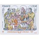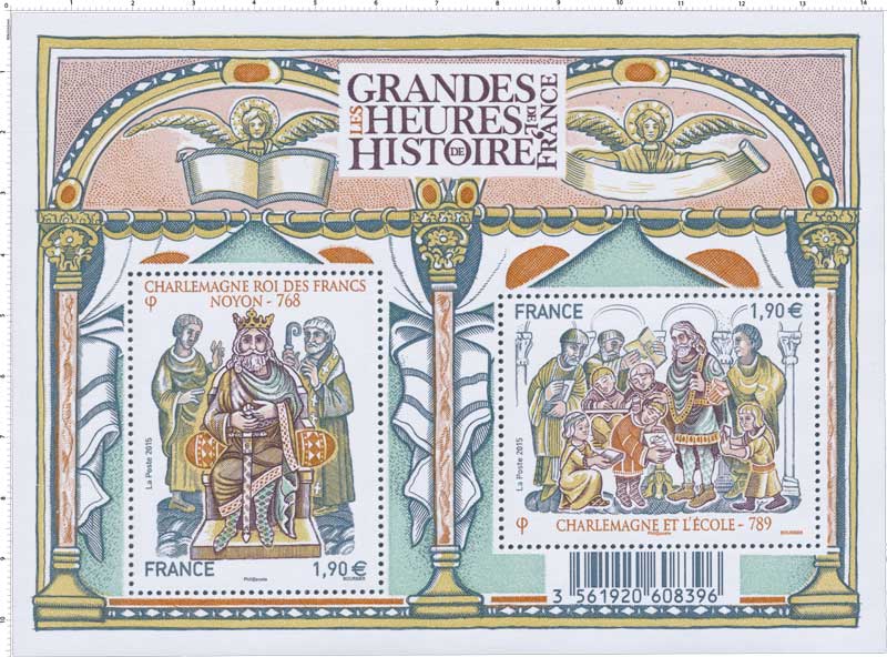 Représentation des timbres : Timbre à date “Premier Jour” conçu par Louis Boursier Roi des Francs de 768 à 814, Charlemagne s’impose de son vivant comme un souverain exceptionnel, qui va marquer de son empreinte l’histoire de l’Occident. Fils de Pépin le Bref, sacré au côté de son père en 754, il est couronné roi à Noyon à l’âge de 20 ans. Poursuivant la politique de conquêtes engagée par ses prédécesseurs, il fonde un immense royaume d’un million de km2, de l’Elbe jusqu’à l’Ebre et de l’Atlantique jusqu’au Danube. Chef incontesté de la chrétienté occidentale, il reçoit la couronne impériale à Rome le jour de Noël de l’an 800. Soucieux d’unifier par la foi chrétienne tous les peuples de l’Empire, il multiplie les écoles afin de former le clergé, et lui apprendre à lire et à écrire correctement le latin. C’est sous son règne qu’apparaît l’écriture cursive (la minuscule caroline, qui remplacera l’écriture gothique, jugée illisible). Charlemagne devient au cours des siècles un empereur de légende, un souverain “idéal” qui sera sacré au XIXe siècle… inventeur de l’école ! |