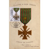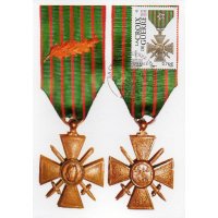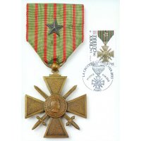| Commentaire | Timbre à date “Premier Jour” conçu par Claude Perchat En savoir plus sur Wikipédia : Croix de guerre 1914-1918 (France) Timbre à date “Premier Jour” conçu par Claude Perchat Description du visuel : représentation de la décoration militaire : "Croix de Guerre 1914-1918" avec 1 citation étoile de bronze À l’aube de la Première Guerre mondiale, la France dispose de deux décorations destinées à récompenser l’héroïsme de ses combattants : la Légion d’honneur et la médaille militaire. Très vite ce cadre apparaît insuffisant au regard du caractère exceptionnel du conflit et de la multiplicité des actes de courage individuels qu’il convient de saluer. La loi du 8 avril 1915 crée une Croix de Guerre destinée à honorer les citations individuelles des officiers, sous-officiers, caporaux et soldats des armées de Terre et de Mer à l’ordre de l’Armée, des Corps d’armée, des Divisions, des Brigades et des Régiments… Conférée aux militaires français ou étrangers qui avaient obtenu les citations requises, la Croix de Guerre fut également attribuée à des civils et, à titre exceptionnel, à des collectivités, villes et villages, unités ou bâtiments de la marine ayant obtenu une citation… |