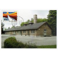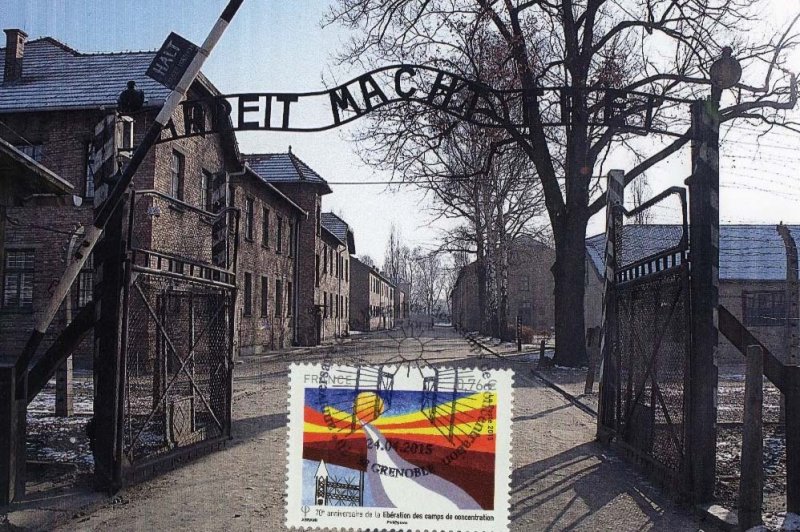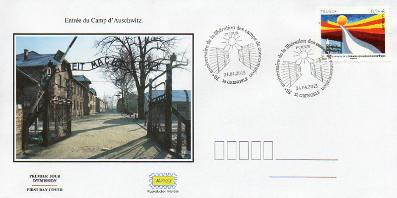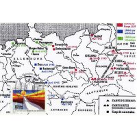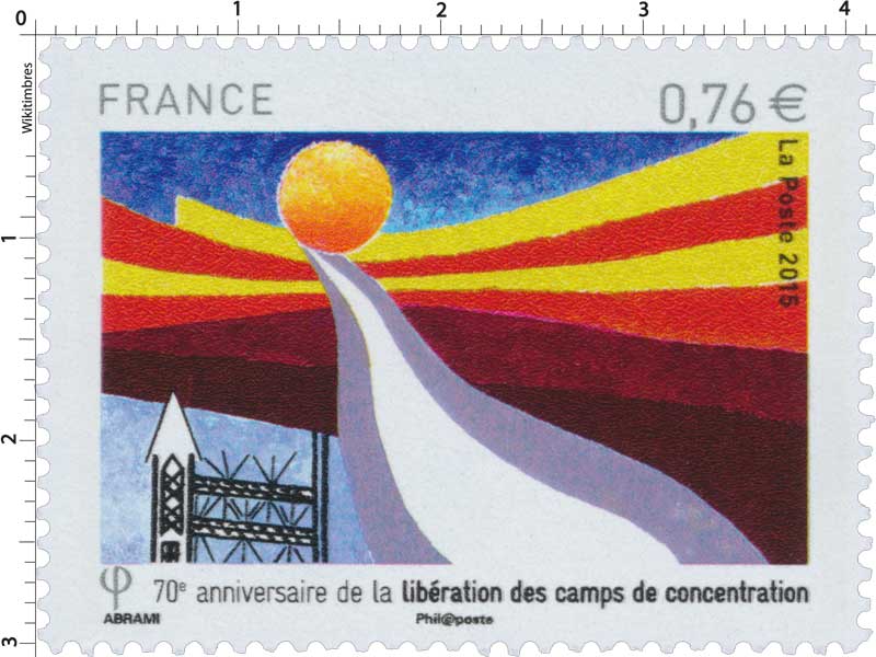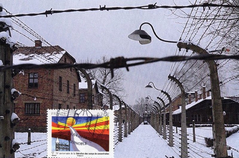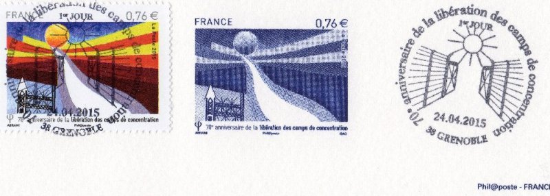 | Commentaire | En savoir plus sur Wikipédia : Camp de concentration Timbre à date “Premier Jour ”conçu par Claude Perchat À partir de janvier 1945, les camps de concentration nazis sont libérés par les armées alliées à la faveur de leur progression en Allemagne et dans les territoires occupés par le Reich. Auschwitz est libéré le 27 janvier 1945 par l’Armée Rouge, qui n’y trouve qu’environ 7 000 survivants ; le 14 avril, les Britanniques sont à Bergen-Belsen, les Américains entrent à Dachau le 29 avril. À Buchenwald, une partie des déportés avait pris le contrôle du camp le 11 avril, quelques heures avant l’arrivée des troupes américaines. Pour les libérateurs, c’est la découverte de l’horreur à l’état brut : outre les monceaux de cadavres qui s’entassent dans des fosses, ils sont également confrontés à des survivants exsangues, durablement éprouvés par leurs conditions d’internement. De plus, quelques jours avant la libération des camps, les nazis ont jeté sur les routes les plus valides des prisonniers, les entraînant dans des “marches de la mort” au cours desquelles nombre d’entre eux meurent de fatigue ou sont sommairement exécutés. Ainsi la période de janvier à mai 1945 est-elle paradoxalement l’une des plus meurtrières pour les détenus des “camps de la mort”. |