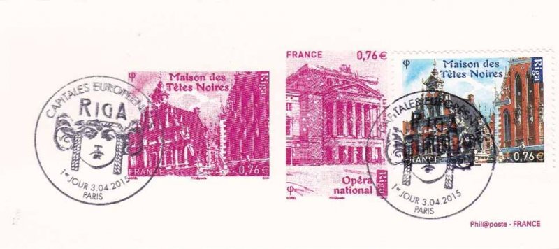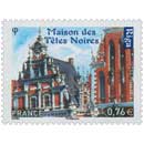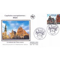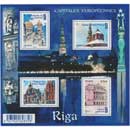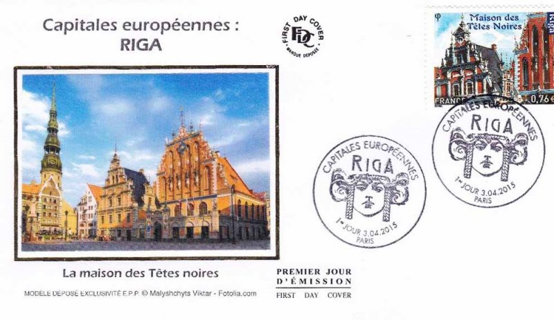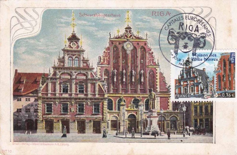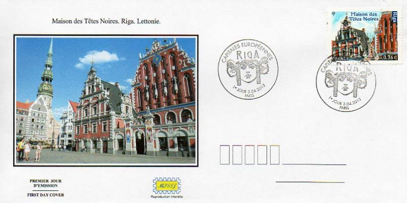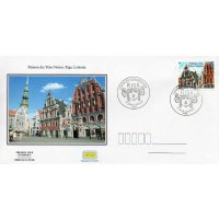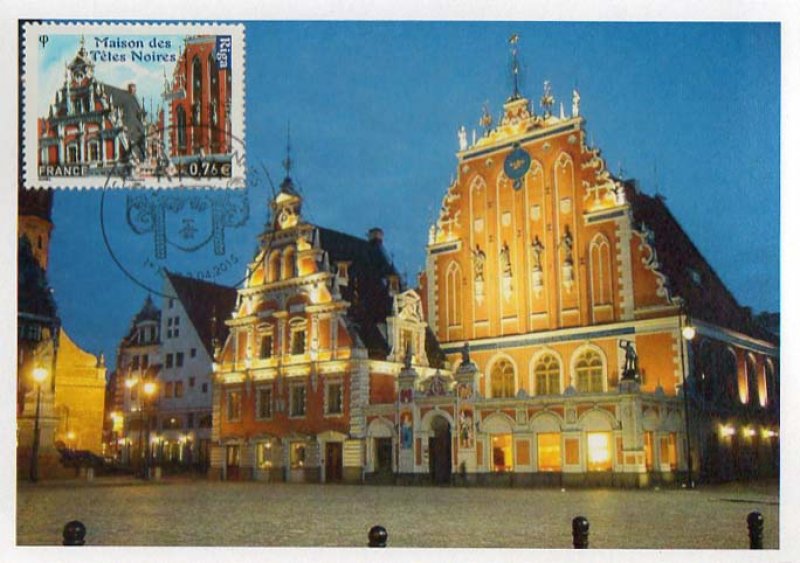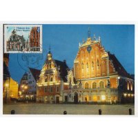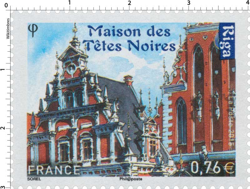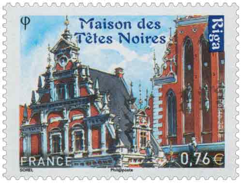 Représentation des timbres : Le bâtiment original qui date de 1344, érigé sur la place faisant face à l'Hôtel de Ville, devint en 1477 une résidence provisoire pour les marchands célibataires de passage à Riga regroupés au sein de la puissante confrérie des "Têtes noires" : une tête d'africain pour emblème, celle-ci faisant probablement référence aux origines nubiennes de Saint-Maurice, saint patron des guildes. Remaniée plusieurs fois au cours des siècles, sa façade du XVIe siècle construite en briques et en pierres, typique du style de la Renaissance néerlandaise, fait de la Maison des Têtes Noires l'un des plus beaux monuments de la capitale lettone. Elle fut néanmoins totalement détruite en 1941 lors d'un bombardement allemand durant la Seconde Guerre mondiale. La paix revenue, les autorités soviétiques dynamitèrent les ruines restantes du monument et les remplacèrent par un jardin, les sculptures ornant la façade étant entreposées dans les musées de la ville. Ce n'est que vers le milieu des années 1990 que l'on décida la reconstruction à l'identique de l'édifice d'après des gravures et des plans. Celle-ci fut achevée en 1999. |