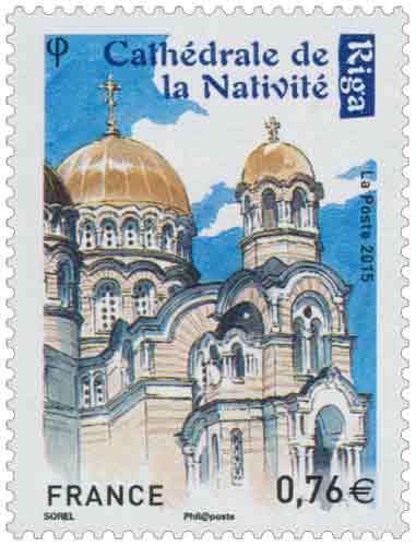 Représentation des timbres : La cathédrale de la Nativité du Seigneur de Riga est l'une des plus grandes cathédrales orthodoxes des pays baltes. Construite entre 1876 et 1883, dans le style néo-byzantin, selon les plans de l'architecte russe Nikolay Mikhailovich Chagin (1823-1909), alors que la Lettonie faisait partie de l’Empire Russe. Elle est connue pour ses iconographies, dont certaines ont été peintes par Vassili Vassilievitch Vereshchagin (artiste russe - 1842-1904). Au cours de la Première Guerre mondiale, les troupes allemandes occupèrent Riga et transformèrent cette cathédrale orthodoxe en église luthérienne. Pendant la période d'Indépendance de la Lettonie de l'entre-deux-guerres, la cathédrale de la Nativité du Christ redevint une cathédrale orthodoxe en 1921, alors que le gouvernement en place, essayait de forcer l'utilisation du letton en tant que langue liturgique. Les autorités municipales de la République Socialiste Soviétique de Lettonie fermèrent la cathédrale en 1961, après une campagne active de fermetures et de démolitions d'églises pendant la période Nikita Sergueïevitch Khrouchtchev en URSS. Elles convertirent le bâtiment en planétarium, et le siège de cathédrale fut tenu par l'église de la Trinité. L’archevêque Jānis Pommers, un Letton d'origine, joua un rôle central dans la défense de la cathédrale de la Nativité. La cathédrale a été rendue au culte orthodoxe depuis que la Lettonie a regagné son indépendance vis-à-vis de l'Union Soviétique, disparue en 1991.