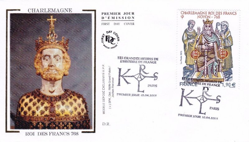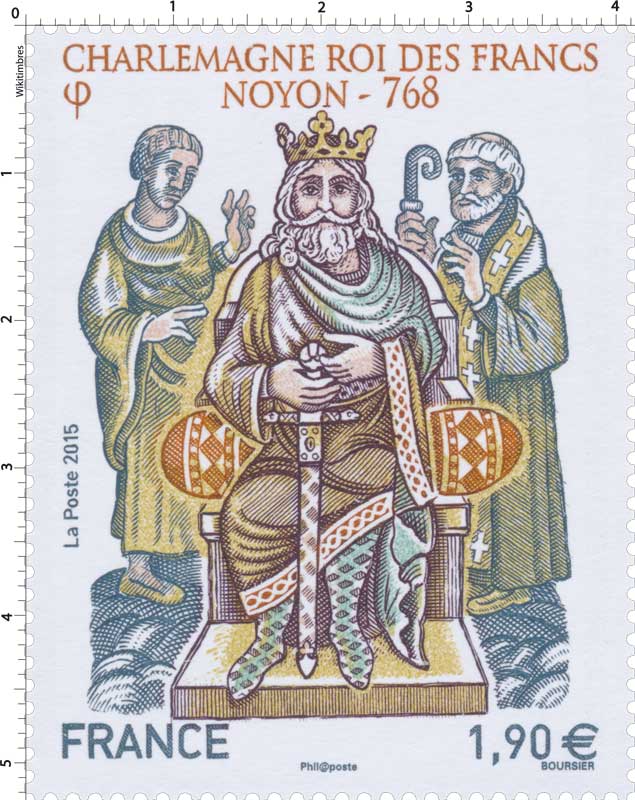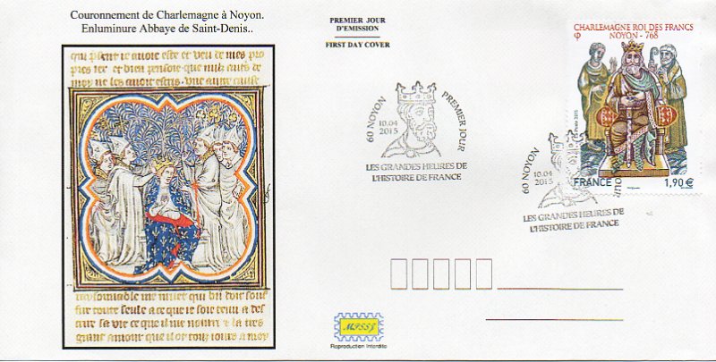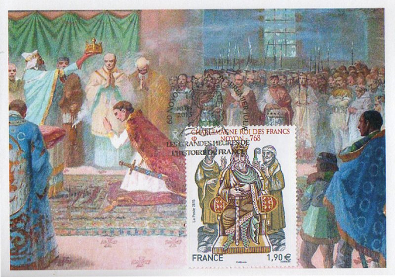 -Couronnement de Charlemagne à Noyon Timbre à date “Premier Jour” conçu par Louis Boursier Description du visuel : Timbre illustré par couronnement de Charlemagne à Noyon (Oise) Histoire des Carolingiens : le premier roi Carolingien est l’ancien maire du palais (741 à 751) de Neustrie (royaume franc), Pépin le Bref (règne de 751 à 768), fils de Charles Martel (v.690-741). Sacré en 754 par le pape Etienne II (752-757), son règne connaîtra de nombreux conflits. Il monte deux expéditions contre les Lombards (754 et 756), et donne au pape Etienne II les terres qui seront les futurs Etats pontificaux. Il conquît la Septimanie (partie du Languedoc-Roussillon) entre 752 et 759 et après huit ans de combat il annexe l’Aquitaine (760-768). A sa mort (768), le royaume est partagé entre ses deux fils qui ne s'entendent guère : Carloman 1er, obtenait le Sud de la Neustrie, la Bourgogne et la Provence et il siégeait à Soissons (couronnement 5 oct.768). Charles 1er, le Grand (Charlemagne), obtenait l'Austrasie et le Nord de la Neustrie, il se fit sacrer roi à Noyon (couronnement 9 oct. 768). En 771, à la mort de son frère, Charles destitue ses neveux, et devient l'unique roi des Francs. Il installe sa capitale à Aquis villa (Aix-la-Chapelle - aujourd'hui, Aachen -Allemagne), y construisant un palais dont la magnifique chapelle deviendra la cathédrale. Il s’assura de l’appui du clergé et de l’aristocratie. Pendant les quarante-six ans que dura son règne, il fit de nombreuses guerres. Entre 773-774, il fait la guerre aux Lombards et fini par les vaincre à Pavie. Il ceint la couronne de fer des lombards. Il prend le nom de Charlemagne. Ce conflit à peine terminé, il entre en campagne contre les Saxons. Cette guerre durera plus de trente ans et elle occupera la plus grande partie de son règne. En 778, il part en campagne en Espagne. Sur le chemin du retour son arrière garde est massacrée à Roncevaux par les Basques (son neveu Roland perd la vie). Il est couronné empereur romain d’Occident le 25 décembre 800. Malgré tous ces conflits, Charlemagne met en place, grâce à son gouvernement et son administration, une véritable cohésion à l’Europe. Il sut s’entourer de bons conseillés, parmi lesquels Alcuin qui organisa une réforme scolaire. |