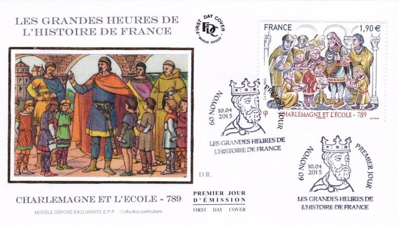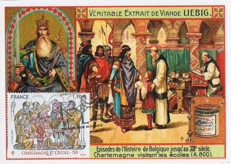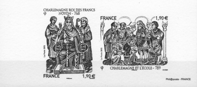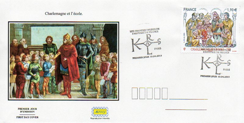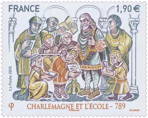 Représentation des timbres du bloc: Timbre à date “Premier Jour” conçu par Louis Boursier Description du visuel : Représentation de Charlemagne visitant une classe dans laquelle les moines instruisaient les enfants (pauvres comme ceux des riches) Histoire des Carolingiens : le premier roi Carolingien est l’ancien maire du palais (741 à 751) de Neustrie (royaume franc), Pépin le Bref (règne de 751 à 768), fils de Charles Martel (v.690-741). Sacré en 754 par le pape Etienne II (752-757), son règne connaîtra de nombreux conflits. Il monte deux expéditions contre les Lombards (754 et 756), et donne au pape Etienne II les terres qui seront les futurs Etats pontificaux. Il conquît la Septimanie (partie du Languedoc-Roussillon) entre 752 et 759 et après huit ans de combat il annexe l’Aquitaine (760-768). A sa mort (768), le royaume est partagé entre ses deux fils qui ne s'entendent guère : Carloman 1er, obtenait le Sud de la Neustrie, la Bourgogne et la Provence et il siégeait à Soissons (couronnement 5 oct.768). Charles 1er, le Grand (Charlemagne), obtenait l'Austrasie et le Nord de la Neustrie, il se fit sacrer roi à Noyon (couronnement 9 oct. 768). En 771, à la mort de son frère, Charles destitue ses neveux, et devient l'unique roi des Francs. Il installe sa capitale à Aquis villa (Aix-la-Chapelle - aujourd'hui, Aachen -Allemagne), y construisant un palais dont la magnifique chapelle deviendra la cathédrale. Il s’assura de l’appui du clergé et de l’aristocratie. Pendant les quarante-six ans que dura son règne, il fit de nombreuses guerres. Entre 773-774, il fait la guerre aux Lombards et fini par les vaincre à Pavie. Il ceint la couronne de fer des lombards. Il prend le nom de Charlemagne. Ce conflit à peine terminé, il entre en campagne contre les Saxons. Cette guerre durera plus de trente ans et elle occupera la plus grande partie de son règne. En 778, il part en campagne en Espagne. Sur le chemin du retour son arrière garde est massacrée à Roncevaux par les Basques (son neveu Roland perd la vie). Il est couronné empereur romain d’Occident le 25 décembre 800. Malgré tous ces conflits, Charlemagne met en place, grâce à son gouvernement et son administration, une véritable cohésion à l’Europe. Il sut s’entourer de bons conseillés, parmi lesquels Alcuin qui organisa une réforme scolaire. |