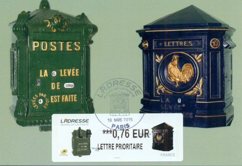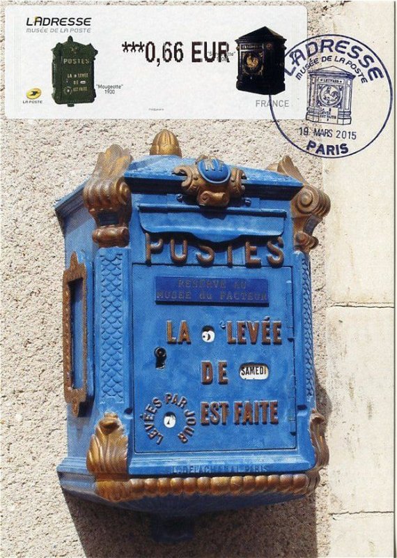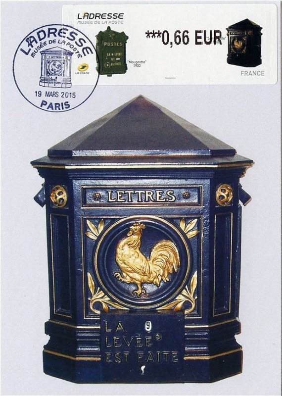 | Commentaire | Léon Paul Gabriel Mougeot (1857-1928) : député de la Haute-Marne et sous-secrétaire d'Etat aux Postes et Télégraphes du 5 juillet 1898 au 7 juin 1902. Il tenta de moderniser le système postal français et rénova le réseau des boîtes aux lettres. Il imposa le modèle vert-bronze (peint en bleu en 1905) du fondeur Savana Delachanal. Celle-ci est un modèle 1900, 1er type, avec indication des heures de lever du courrier. On baptisa ces boîtes des "Mougeottes". La caractéristique majeure de la Mougeotte est d’être installée aux frais du demandeur (commerçant, particulier, etc.). Par la suite, la Poste la considère comme une BAL traditionnelle, relevée comme n’importe quelle autre. Julien Simyan (1850-1926) : sous-secrétaire d’Etat chargé des Postes dans le cabinet Clémenceau, se prend pour un grand réformateur du service postal et fait publier le 10 août 1908 une circulaire remettant en cause les règles de l’avancement et des mutations. Cela aboutira a la grève des postiers de mars et mai 1909. Le 20 juillet 1909, le ministère de Clémenceau tombe entraînant le secrétaire d’Etat avec lui. Malgré une façade où plastronne un fier "coq gaulois" tout d’or vêtu et un fond incliné à 45° permettant de faire glisser aisément les lettres et cartes au levage, les "Simyanettes" n’auront pas le succès des "mougeottes" et l’implantation ces boîtes aux lettres est rapidement abandonnée. La couleur évolue : le bois brut est progressivement recouvert de bleu, dont la variante émail ciel est établie en 1912 comme couleur officielle. Le vert fait son apparition en ville à la fin du 19e siècle, alors qu’il faut attendre 1962 pour que le jaune habille l’ensemble du parc.