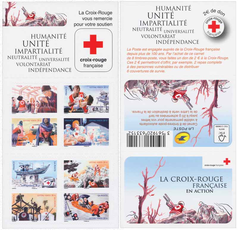 | Commentaire | Ce carnet est grevé d'une surtaxe de 2,00 € de don à la Croix-Rouge Description des visuels : Ces huit timbres illustrent les actions humanitaires principales de la Croix-Rouge, sur le carnet sont repris en exergue la philosophie de ses actions : humanité, unité, impartialité, neutralité, universalité, volontariat, indépendance. Tsunami et tremblement de terre sous-marin en Asie, séisme à Haïti, tempête Xynthia en France, ces catastrophes sont naturelles. Les timbres racontent donc les interventions dans l’urgence de la Croix-Rouge lors de tels désastres humains et matériels. Les timbres n’ont pas de titre, ils symbolisent d’autres interventions et catastrophes, en France ou à l’étranger. Recherches de personnes encore vivantes dans des décombres, premiers soins, approvisionnement en eau, en nourriture, abris construits rapidement, hôpitaux mobiles... pour sauver des vies humaines ou venir en aide à des sinistrés. Pour chaque carnet acheté, 2 e sont reversés à la Croix-Rouge française afin de soutenir son action. |