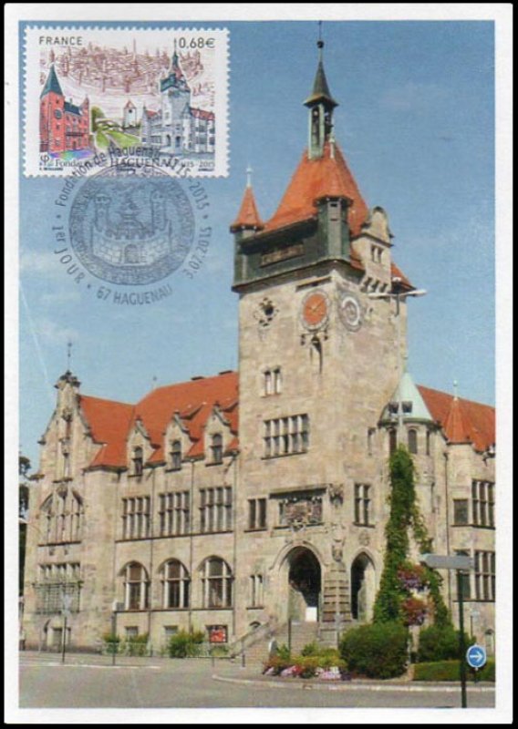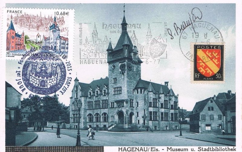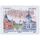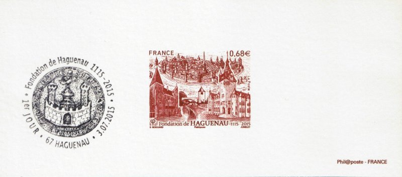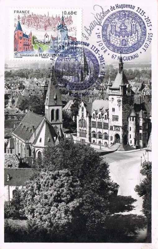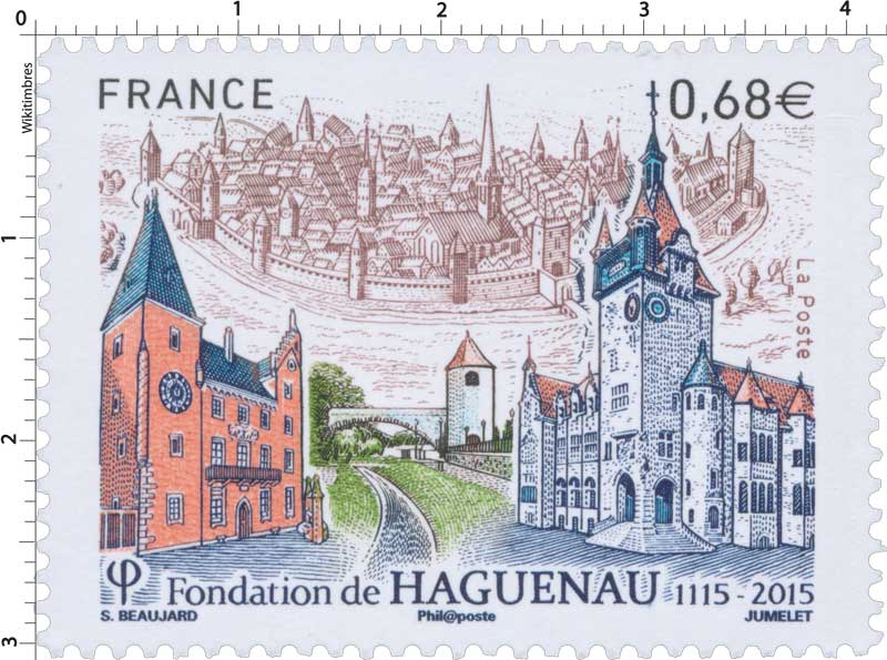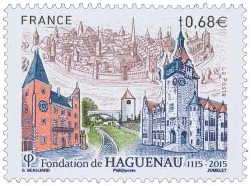 | Commentaire | En savoir plus sur Wikipédia : HAGUENAU Description du visuel : en arrière plan, une vue de la ville de haguenau au XVIIe siècle, au centre la tour des Pêcheurs (XIIIe siècle), à droite le musée historique (1904), à gauche la maison de la chancellerie et musée alsacien (XVe siècle)