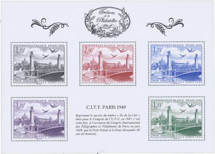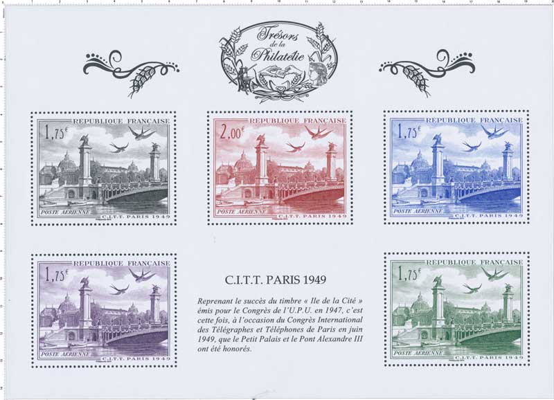 | Commentaire | Feuillet provenant de la pochette "Trésors de la Philatélie" Visuel : La Conférence Internationale Télégraphique et Téléphonique de Paris, réunie sous l'égide de l'UIT (Union Internationale des Télécommunications) s'est tenue du 15 juin au 3 juillet 1949. Elle avait notamment pour but de rechercher une harmonisation internationale des tarifs, des codifications, des transports et de la comptabilité des télégrammes et radiotélégrammes internationaux. Elle faisait suite aux Conventions Internationales des Télécommunications qui s'étaient tenue à Madrid en 1932 et à Atlantic City en 1947. |