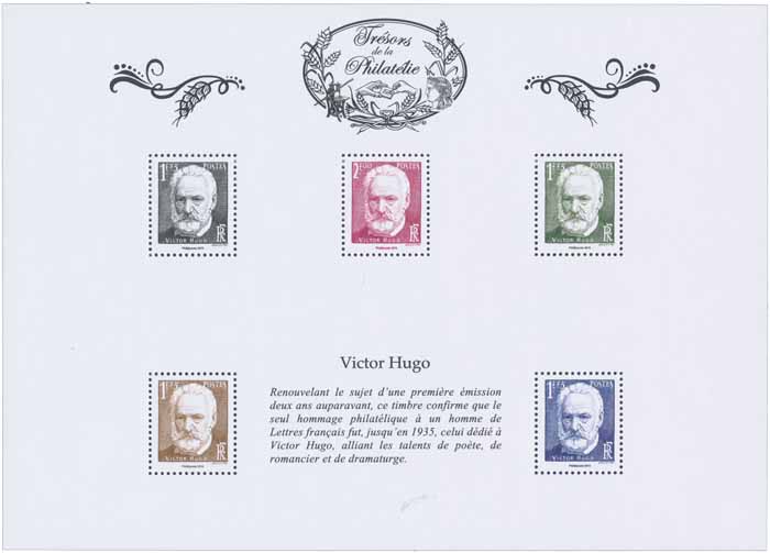 | Commentaire | Feuillet provenant de la pochette "Trésors de la Philatélie" Ensavoir plus sur Wikipédia: Victor Hugo |