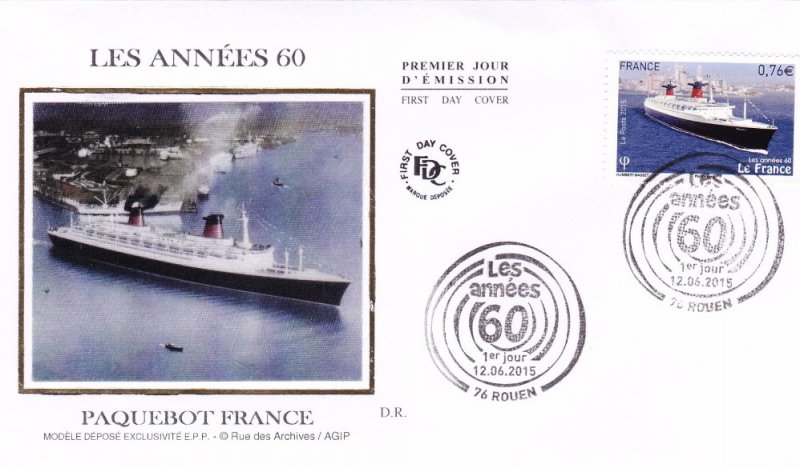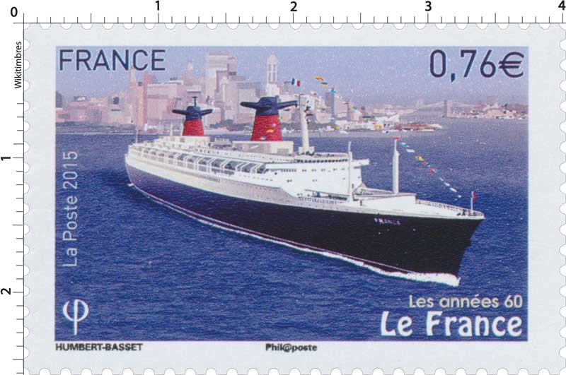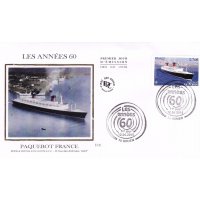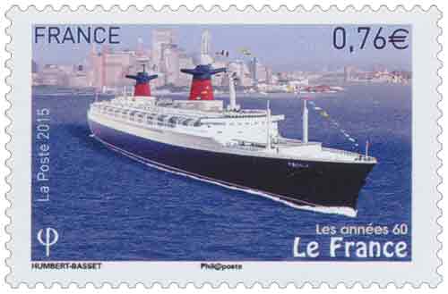 | Commentaire | Dans la même série voir 2014 Les années 50 En savoir plus sur Wikipédia : Années 1960 En savoir plus sur Wikipédia : France (paquebot) Le paquebot transatlantique "France" (rebaptisé "Norway" en 1979, puis "Blue Lady" en 2006) construit aux Chantiers de l'Atlantique (STX France), à Saint-Nazaire (44-Loire-Atlant.), où il fut mis à l'eau le 11 mai 1960, en présence du Président de la République française, Charles de Gaulle (18ème président - 1959-1969). Il fut pendant une longue période le plus grand paquebot du monde. Son port d'attache est alors au Havre (76-Seine-Maritime), et il est mis en service le 19 janvier 1962, pour le compte de la Compagnie Générale Transatlantique (CGT). Luxueusement meublé, le paquebot a été décoré par plusieurs peintres de l'École de Paris (jusqu'aux années 60), notamment par Louis Vuillermoz (1923 – peintre et lithographe). Pendant douze ans, il assure des traversées transatlantiques et quelques croisières autour du monde, jusqu'en septembre 1974. Caractéristiques : Long.: 315,66 m, maître-bau : 33,70 m, tirant d'eau : 10,48 m, déplacement : 57 607 T, propulsion: 4 groupes CEM-Parsons + 4 hélices fixex de Ø 5,8 m, puissance : 160 000 ch., vitesse : 31 noeuds, 12 ponts. |