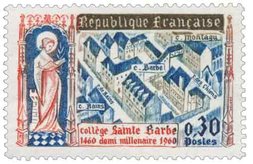 | Commentaire | Émis pour commémorer les cinq cents ans du Collège Sainte-Barbe, ce timbre rend hommage à l’une des institutions universitaires les plus anciennes et les plus singulières de Paris, implantée depuis 1460 au cœur du quartier Latin, à proximité immédiate du Panthéon. Fondé par Geoffroy Lenormant, professeur à l’Université de Paris, le collège s’est distingué très tôt par son indépendance intellectuelle et son ouverture pédagogique, notamment par l’introduction précoce de l’enseignement du grec dès le XVe siècle, puis par l’attention portée aux langues, aux séjours à l’étranger et aux méthodes actives. La figurine associe plusieurs registres visuels : la statue de Sainte Barbe, patronne des métiers exposés aux risques, le bâtiment du collège et le plan de son environnement immédiat, où apparaissent les noms des rues et des établissements voisins, rappelant la densité universitaire historique de la montagne Sainte-Geneviève. Par ce choix iconographique composite, l’administration postale souligne à la fois la continuité spirituelle, l’ancrage urbain et la vocation éducative d’un collège qui a formé, du XVe au XXe siècle, des personnalités aussi diverses qu’Ignace de Loyola, Calvin, Jaurès, Péguy, Eiffel ou Blériot. L’émission s’inscrit dans la tradition des timbres commémoratifs de 1960, privilégiant une gravure en taille-douce précise et lisible, adaptée à un sujet institutionnel à forte portée historique et culturelle. Article rédigé pour WikiTimbres.