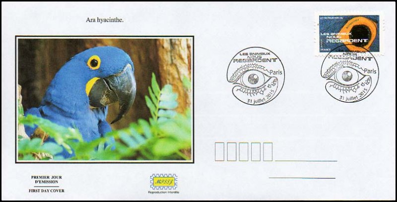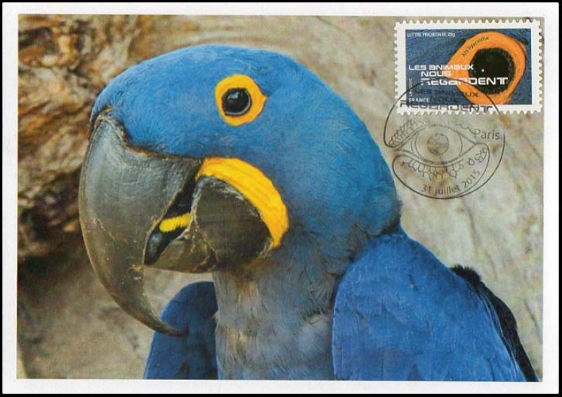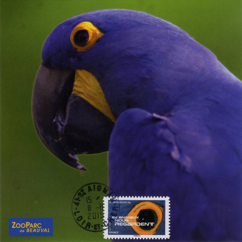 | Commentaire | En savoir plus sur Wikipédia : Ara hyacinthe Ara hyacinthe (Anodorhynchus hyacinthinus) – famille des Psittacidés : envergure de 130 à 150 cm, poids de 1,4 à 1,7 kg, un tiers de ses muscles se situe dans sa tête. Plumage bleu-cobalt, zone nue jaune autour de l'œil et de la mâchoire inférieure du bec, le bleu est légèrement plus foncé sur les ailes, dessous de queue et ailes noirâtres. Bec extrêmement puissant (15kg/cm2), noirâtre, iris foncé-brun, pattes gris foncé. Il possède une voix très puissante. Espèce endémique de l'Amérique du Sud. |