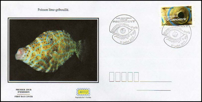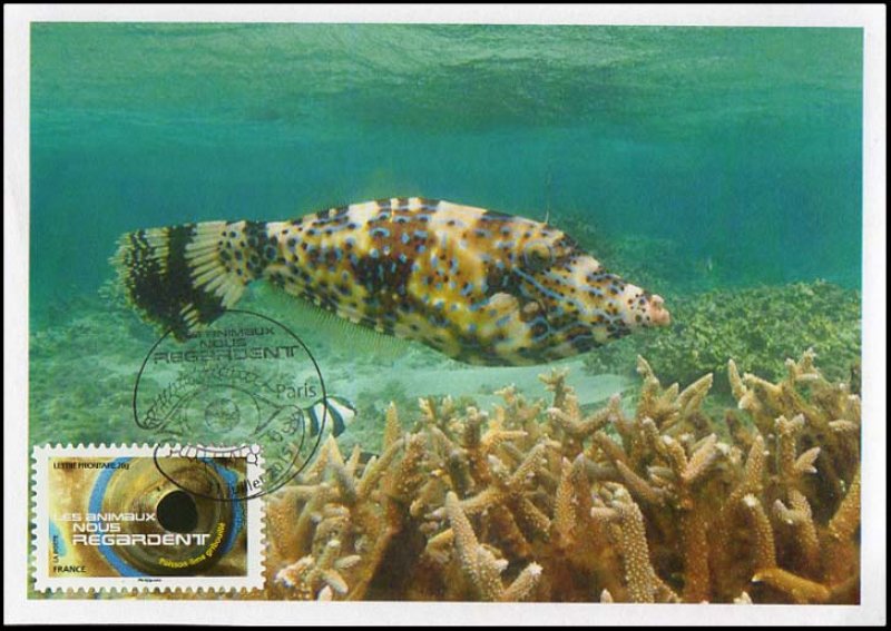| Commentaire | En savoir plus sur Wikipédia : Aluterus scriptus Poisson-lime gribouillé (Aluterus scriptus), Poisson bourse robe de cuir, Bourse écriture : Toutes les mers tropicales et subtropicales. Il est présent aux Antilles, en Polynésie française, en Nouvelle-Calédonie et à la Réunion. Poisson allongé, au corps très comprimé latéralement. Taille de 60 cm à 110 cm. Couleur marron à grise, maculée de petites taches noires. Nombreuses lignes et taches bleues sur le corps. Il vit le long des tombants des zones récifales, des roches et des épaves parmi lesquels il se camoufle (entre - 2 et - 80 m, dans les eaux côtières). La première nageoire dorsale, située au niveau des yeux, est semblable à une longue épine recourbée vers l'arrière du corps. Il a une tête très allongée. Sa mâchoire comporte des dents pointues. Le corps est recouvert d'écailles rendues rugueuses par la présence de petites épines (d'où son surnom). La fente branchiale est oblique. Il a une longue queue en forme de gros pinceau. C'est un "mange-tout" qui met à son menu des algues, zostères, et autres plantes à fleur marines, des gorgones, des hydraires et des ascidies. |